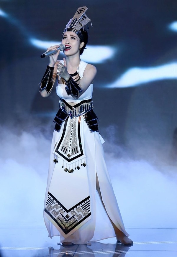Quán quân The Remix 2015 diện bộ váy trắng tua rua óng ánh nổi bật trong tập 4 với chủ đề Shake your body. Thiết kế giúp người đẹp tự tin khoe ngoại hình cân đối và vũ đạo gợi cảm. Đi kèm trang phục là kiểu tóc xoăn bồng bềnh quyến rũ và tông trang điểm rạng rỡ.