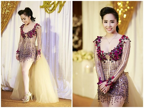 | Trong tiệc cưới của mình vào cuối tuần - 23/11, "Cá sấu chúa" Quỳnh Nga diện những bộ váy cưới xuyên thấu quyến rũ, song một trong số đó lại không mấy ấn tượng, thậm chí còn bị chê là lỗi mốt và quá nhiều chi tiết. Vạt váy sau hông trở nên thừa thãi, nặng nề khiến hình ảnh cô dâu xinh đẹp trở nên kém thanh thoát. |