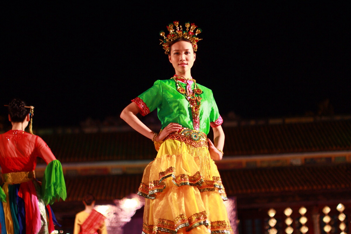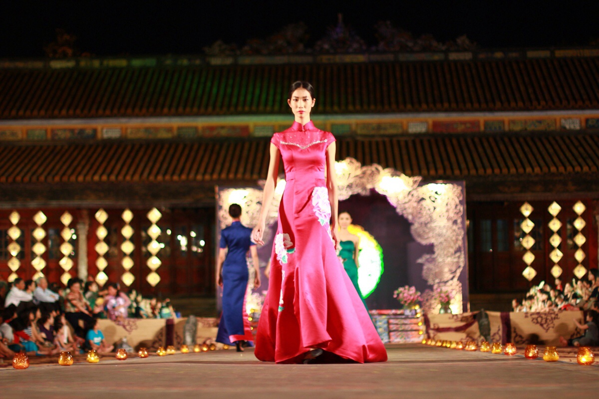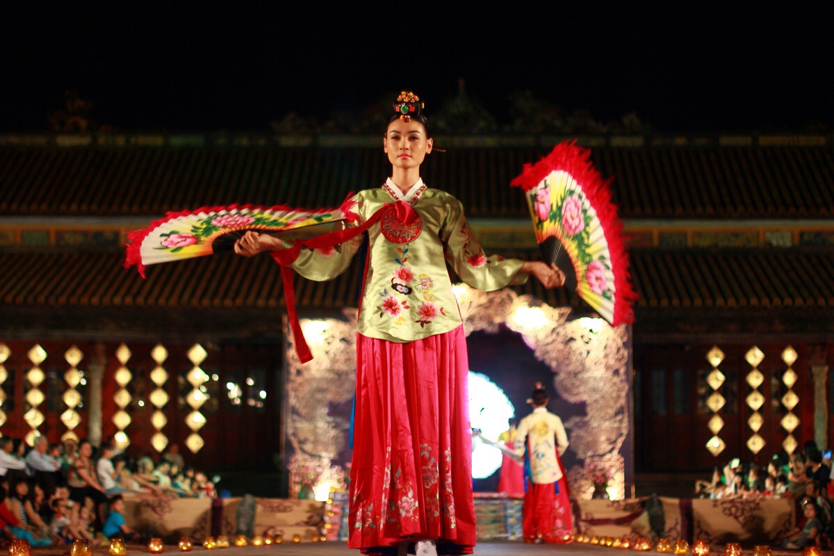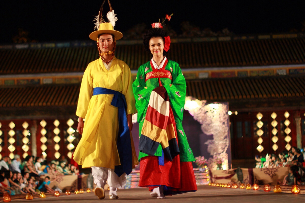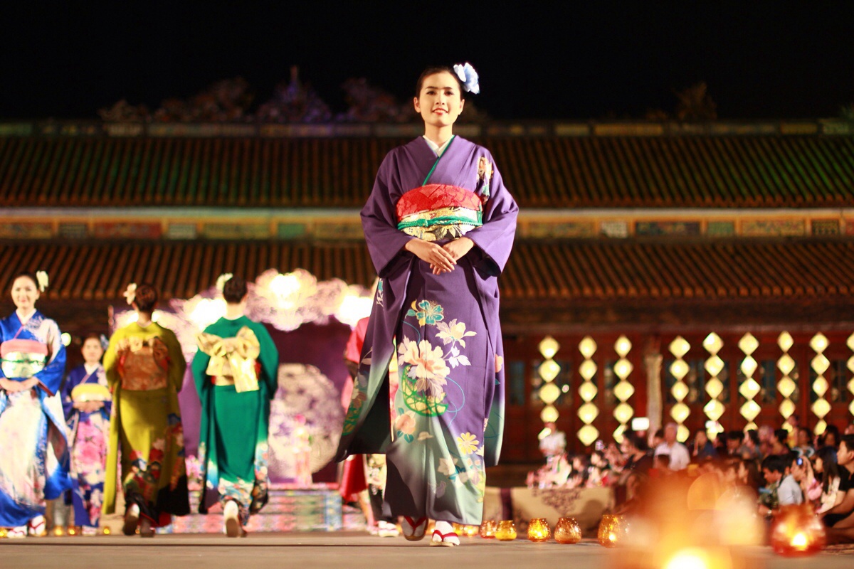 Dàn người mẫu lộng lẫy trên sàn catwalk trong các trang phục kimono, hanbok, sườn xám... của Nhật Bản, Hàn Quốc, Trung Quốc... tại Đại Nội (Huế) tối 15/4.