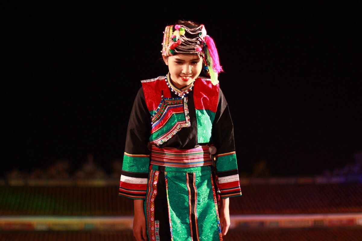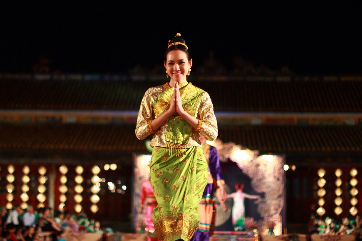 Nhóm người mẫu Myanmar trực tiếp trình diễn. Những bộ trang phục truyền thống cùng vũ điệu chào khán giả rất chỉnh chu và bài bản.