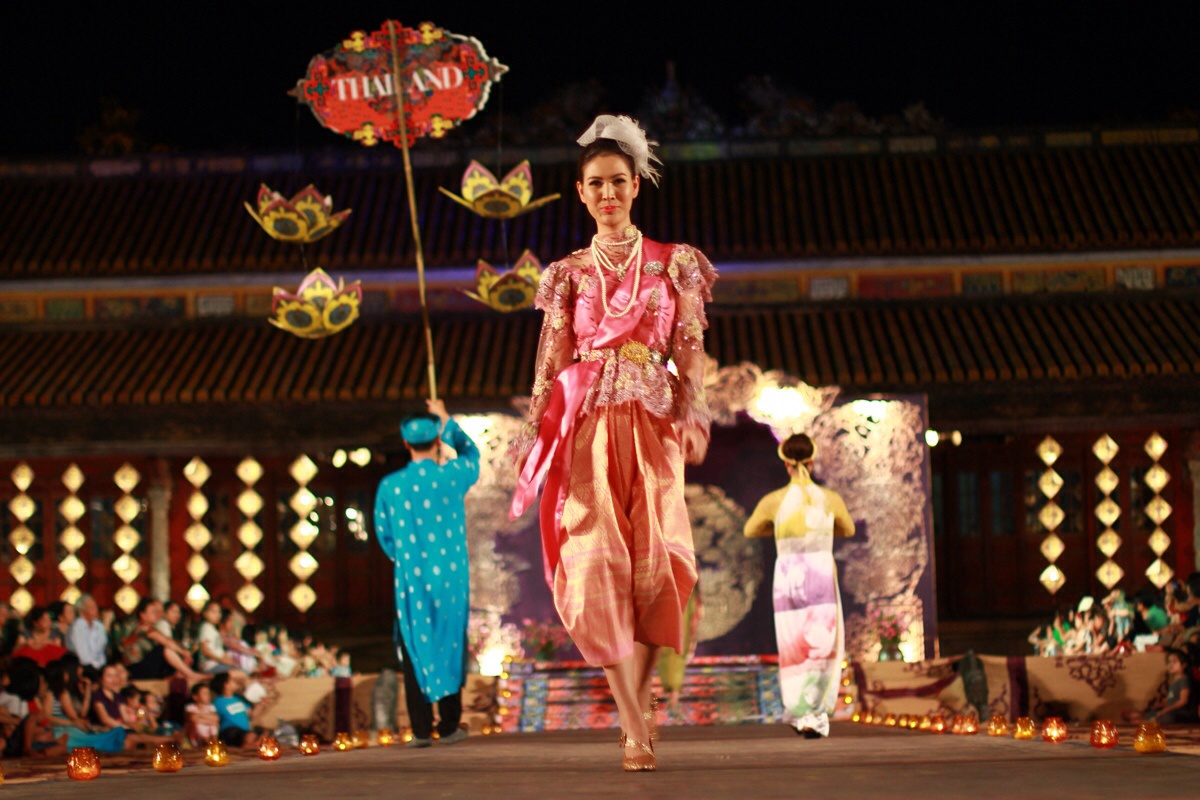 Trang phục thanh lịch với những hoa văn thổ cẩm hiền hòa bởi màu sắc tinh tế và thanh nhã trên nền lụa tơ tằm quý giá là hình ảnh tiết mục trình diễn của Thái Lan.