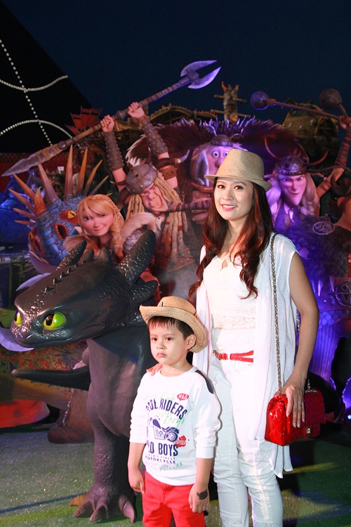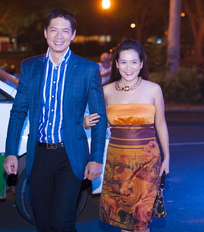Bà xã nam diễn viên Bình Mình có tên trong danh sách này vì bộ trang phục ôm dáng có tông màu và họa tiết không phù hợp với xu hướng chung. Phụ kiện mix cùng có phong cách hiện đại không mấy ăn nhập họa tiết truyền thống trên váy.