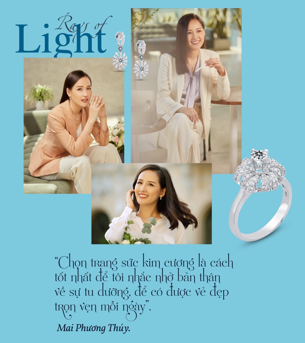 Trang sức gắn kim cương siêu lý tưởng 8 Hearts & 8 Arrows được Hoa hậu Mai Phương Thúy lựa chọn với những suy nghĩ rất riêng: “Tôi tìm thấy ở kim cương, đặc biệt là những viên kim cương 8 Hearts and 8 Arrows rất nhiều sự đồng điệu. Là một nhà đầu tư tài chính, tôi hiểu rất rõ giá trị và độ giữ giá của những món trang sức được chế tác từ kim cương. Là một tín đồ của thời trang và trang sức cao cấp, tôi càng hiểu rõ giá trị của những viên kim cương 8 Hearts & 8 Arrows không chỉ dừng lại ở đó. Mỗi viên kim cương ấy đặc biệt như chính chủ nhân của nó bởi không chỉ được tạo ra từ áp lực, nó còn là kết quả của tinh hoa chế tác”.