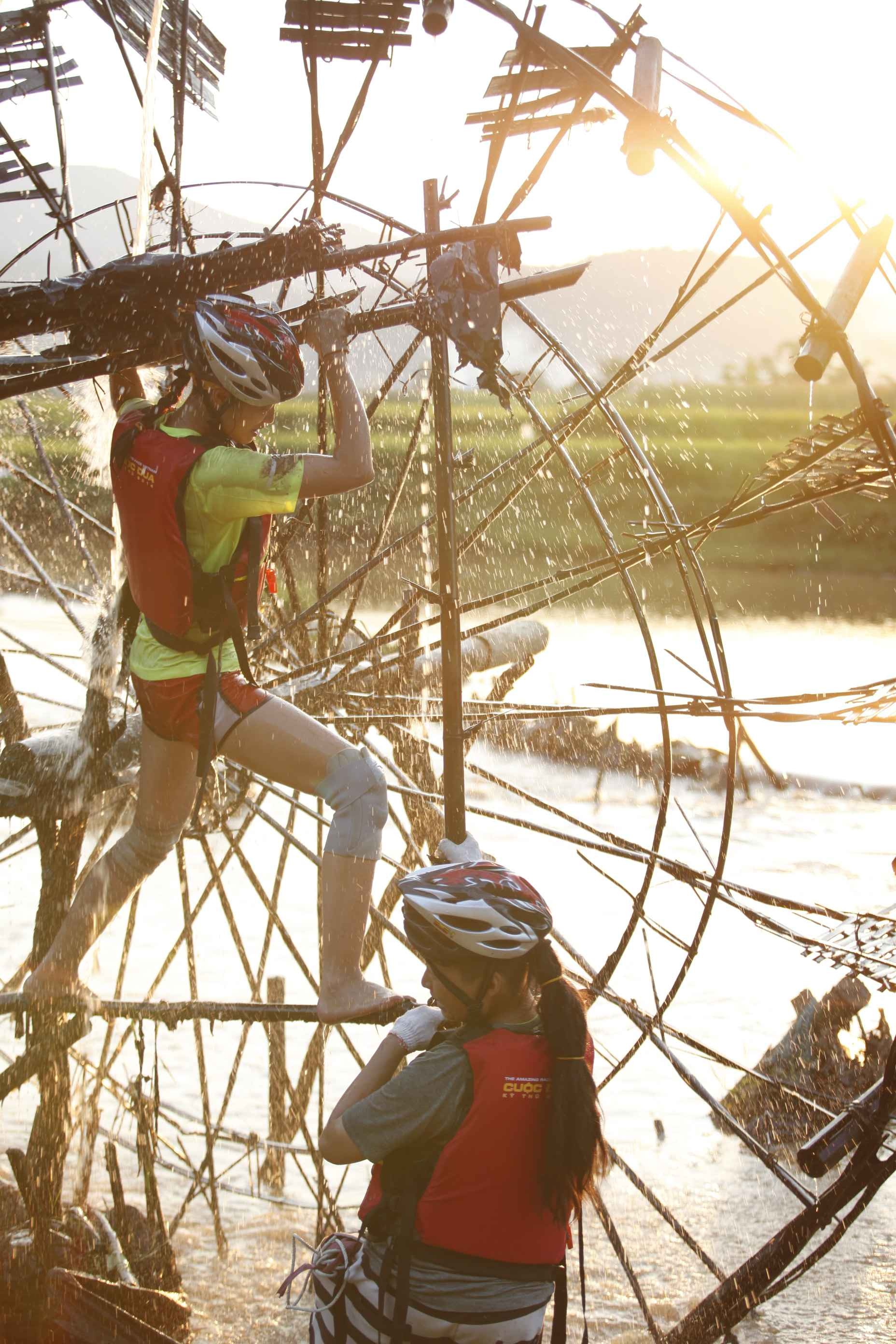 | Các đội đua được thử sức làm máng nước và tiếp xúc với cọn nước - một vật dụng rất quen thuộc với đồng bào vùng cao. |