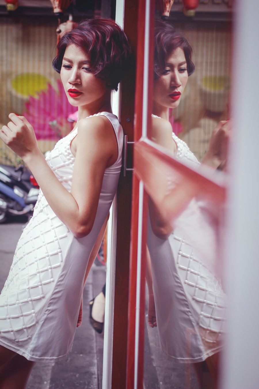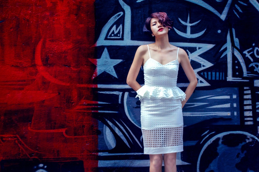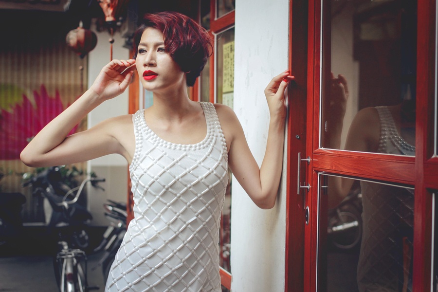 | Nữ người mẫu diện đầm trắng, ôm dáng khoe đường cong khi xuống phố. Mái tóc ngắn nhuộm đỏ cá tính giúp cô thêm nổi bật. |