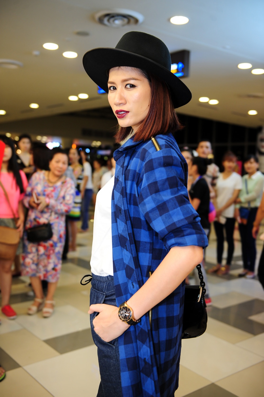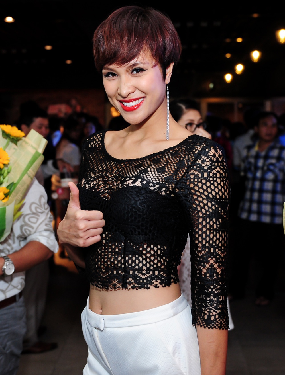 | Người mẫu Phương Mai diện crop top ren xuyên nội y ở sự kiện công chiếu Bộ ba rắc rối. Cô đang tham gia show truyền hình Điệp vụ tuyệt mật. |