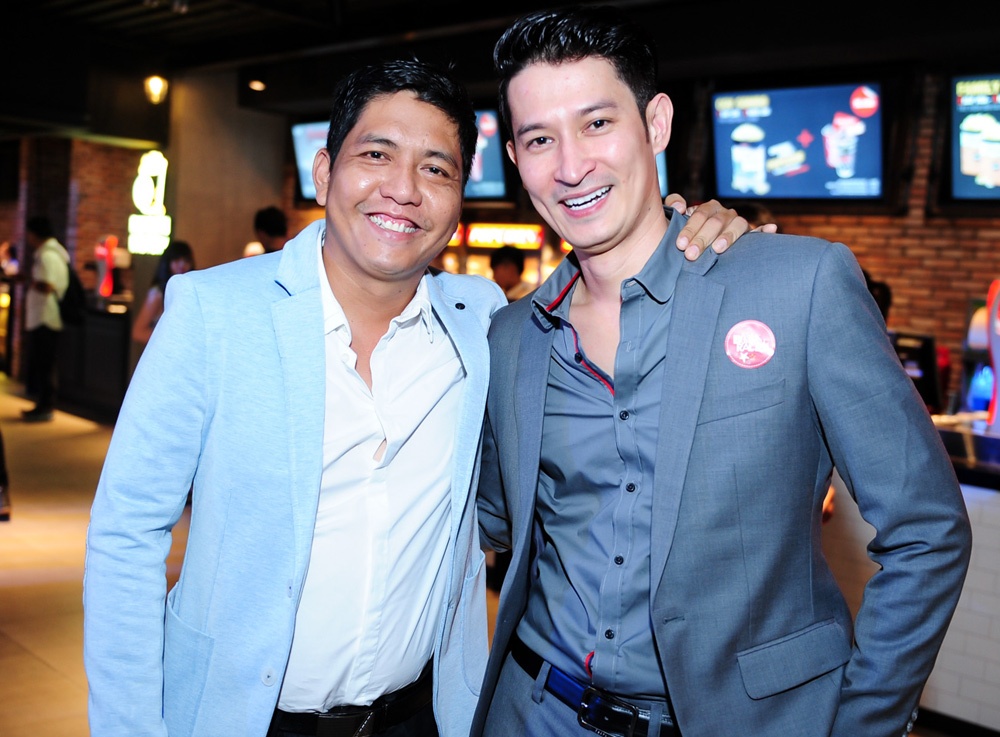 | Đạo diễn, kiêm diễn viên Đức Thịnh vui mừng khi hội ngộ Huy Khánh ở buổi công chiếu. |
