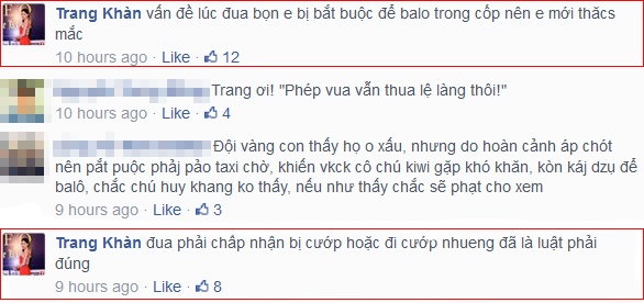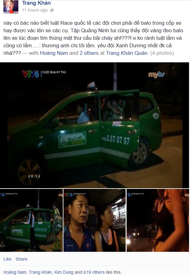 | Trang Trần bày tỏ sự bức xúc trên trang mạng cá nhân cùng hình ảnh 2 cô gái đội Vàng cầm balô lên xe ngay trước cuộc rượt đuổi taxi với đội Xanh Dương. |