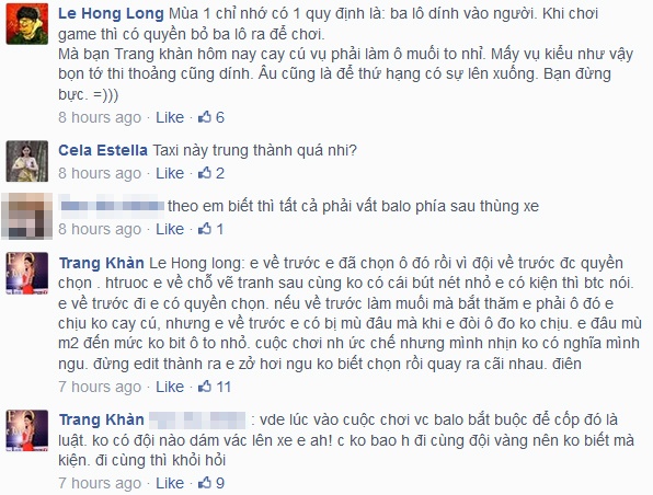 Ở phần bình luận, Trang Trần cho biết, trước khi vào cuộc, các đội bị bắt phải để balô trong cốp xe nếu di chuyển bằng taxi. Cô gái của đội Cam khẳng định "đã là luật thì phải đúng".