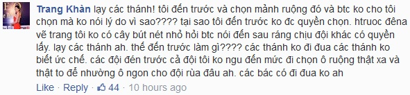 | Trang Trần bức xúc trả lời những bình luận chê trách hành động của đội Cam ở thử thách làm muối trên trang mạng xã hội chính thức của Cuộc đua kỳ thú. |