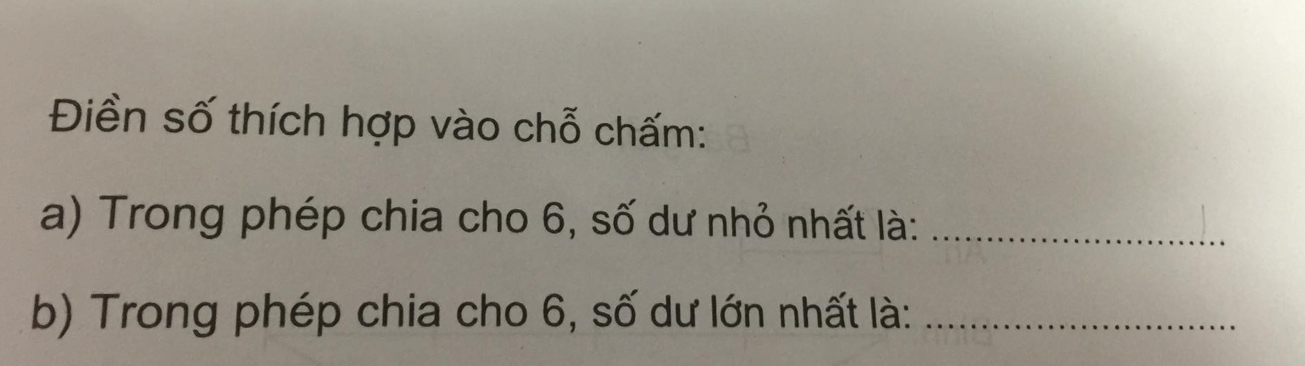 b) Trong phép chia cho 6, số dư lớn nhất là…".