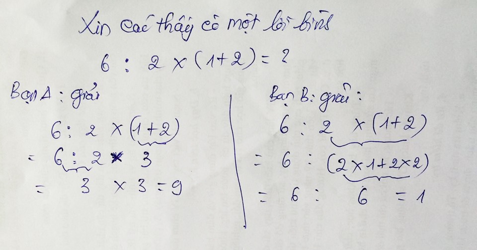 6 : 2 x (1 + 2) = 6 : (2 x 1 + 2 x 2) = 6 : 6 = 1