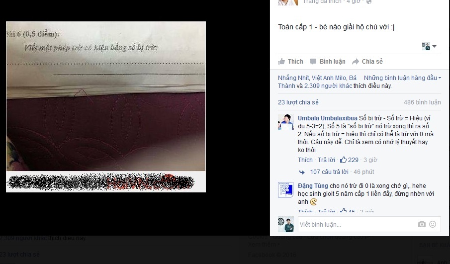 Vừa qua, một fanpage trên mạng xã hội Facebook chia sẻ bài toán tiểu học với nội dung: "Viết một phép trừ có hiệu bằng số bị trừ?" thu hút 2.000 lượt thích (like) và hàng trăm lượt bình luận.