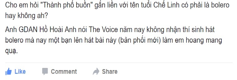 Lý do vì trong buổi họp báo ra mắt giới truyền thông ngày 8/2, giám đốc âm nhạc Giọng hát Việt 2017, nhạc sĩ Hồ Hoài Anh đã nhấn mạnh không nhận các giọng ca bolero tham gia và đề nghị họ tìm đến cuộc thi dành riêng cho nhạc này.