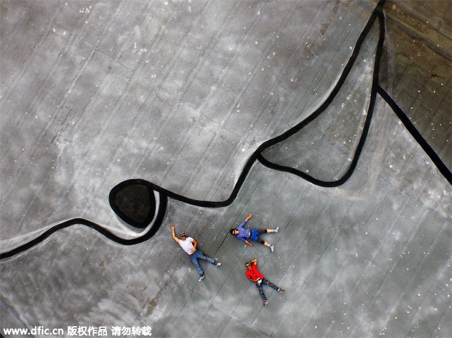 | Vài thanh niên tham dự lễ hội nghệ thuật đường phố NuArt nằm trên bức tranh tường lớn nhất thế giới. |