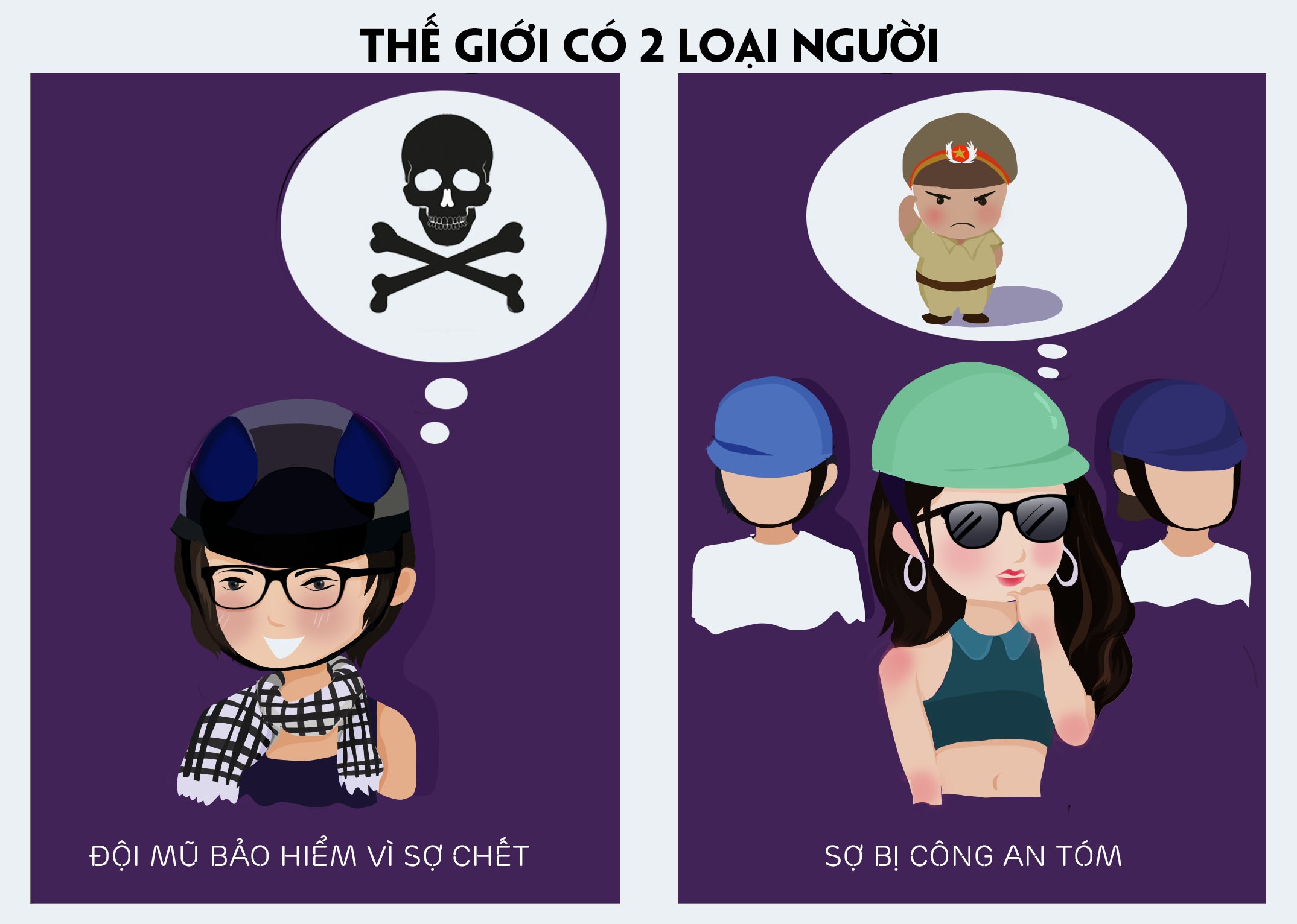 Bộ tranh “phân loại” người đội mũ bảo hiểm khiến người xem thích thú vì yếu tố hài hước và nội dung đánh vào tâm lý đám đông.