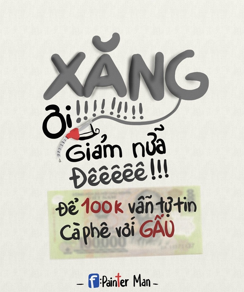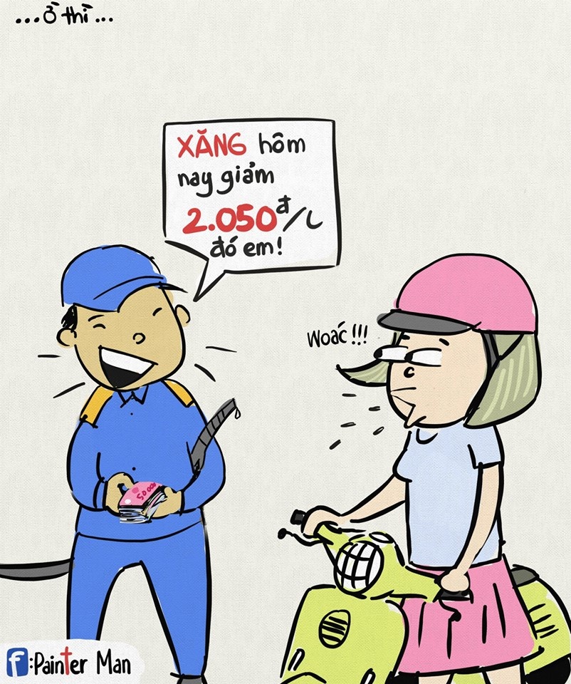 | Ngày 22/12 giá xăng bất ngờ giảm mạnh hơn 2000 đồng/lít khiến người dân xôn xao. Thông tin này lập tức tạo nên cơ sốt trên mạng xã hội, trở thành đề tài bàn tán của rất nhiều người. Trước sức nóng của tin tức, Hoàng Anh Đức PainterMan nhanh chóng thực hiện bộ tranh vui, thể hiện cảm xúc phấn khởi của mình cũng như rất nhiều người khi nghe tin giá xăm giảm sâu vào dịp cuối năm. |