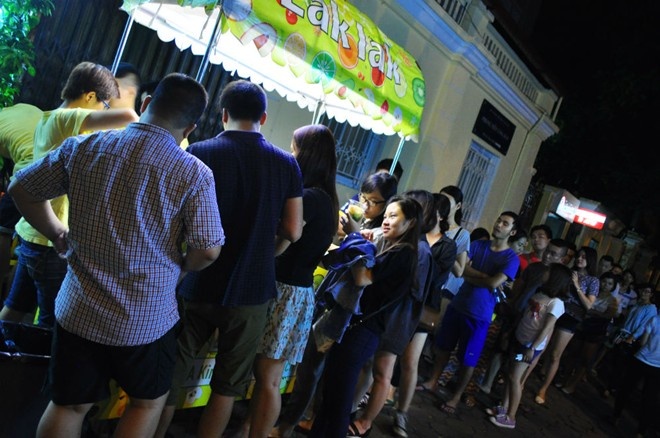| Cảnh xếp hàng dài ở quán buffet hoa quả tự múc trên phố Trần Hưng Đạo. |