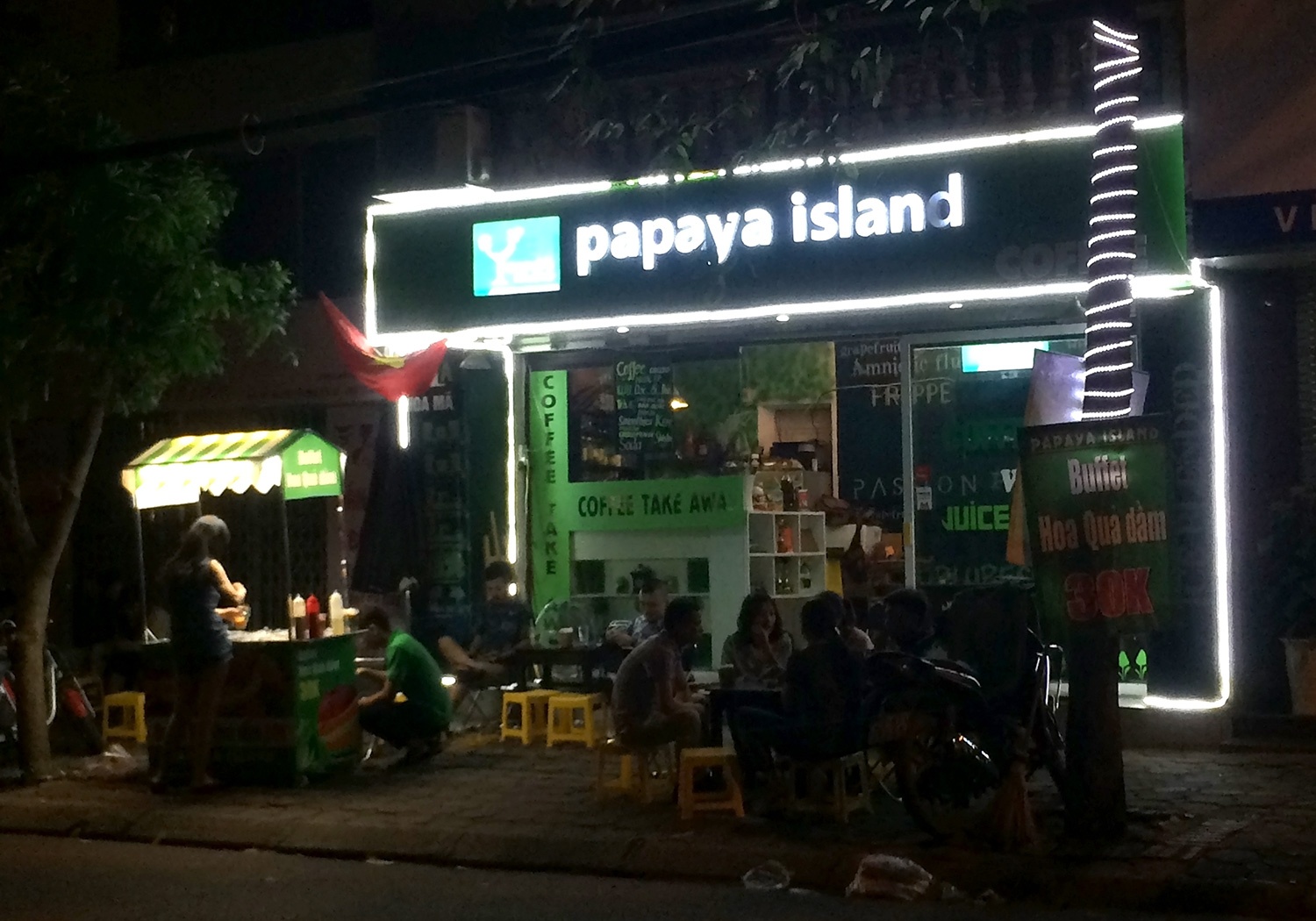 | Một quán cà phê trên phố Hòa Mã buổi tối cũng xoay ra bán buffet hoa quả dầm. |