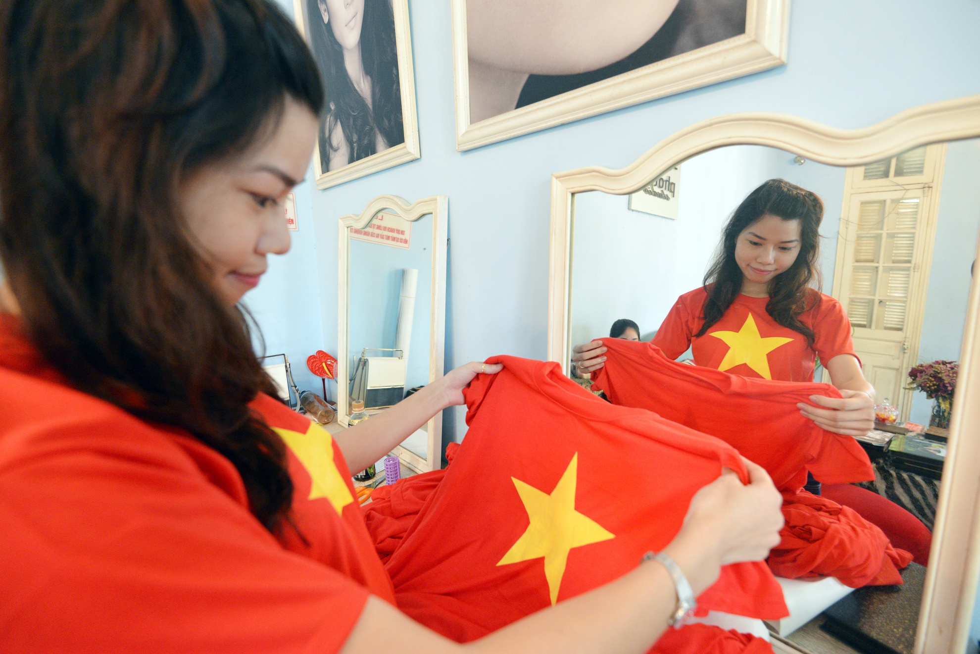 Đến đây khách sẽ được cho mượn áo hình quốc kỳ, có đủ loại cỡ để lựa chọn rồi đứng xếp hàng chờ đến lượt.