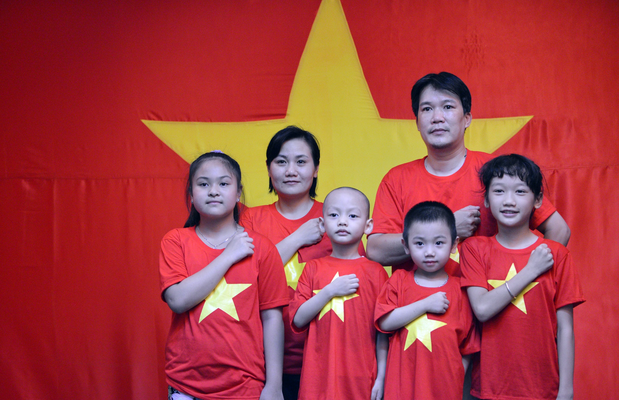 Có khá nhiều gia đình đến studio nhân dịp này. Trong ảnh là vợ chồng anh Thái cùng các con, cháu, cả nhà thể hiện tình yêu với Tổ quốc bằng cách đặt tay lên ngực trái chụp rất nhiều ảnh.