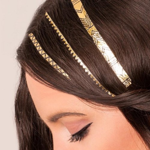Để có được vẻ ngoài bắt kịp mốt, bạn chỉ cần phết một lớp keo mỏng, sau đó đặt các miếng vàng lên và dùng cọ trang điểm giúp chúng dính chặt vào tóc. Ngoài ra, mọi người còn có thể ứng dụng linh hoạt hơn bằng cách làm nhỏ các lá vàng, rắc lên chân tóc hoặc bím tóc sau khi tết.
