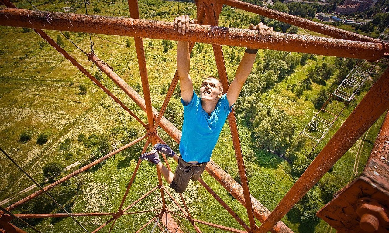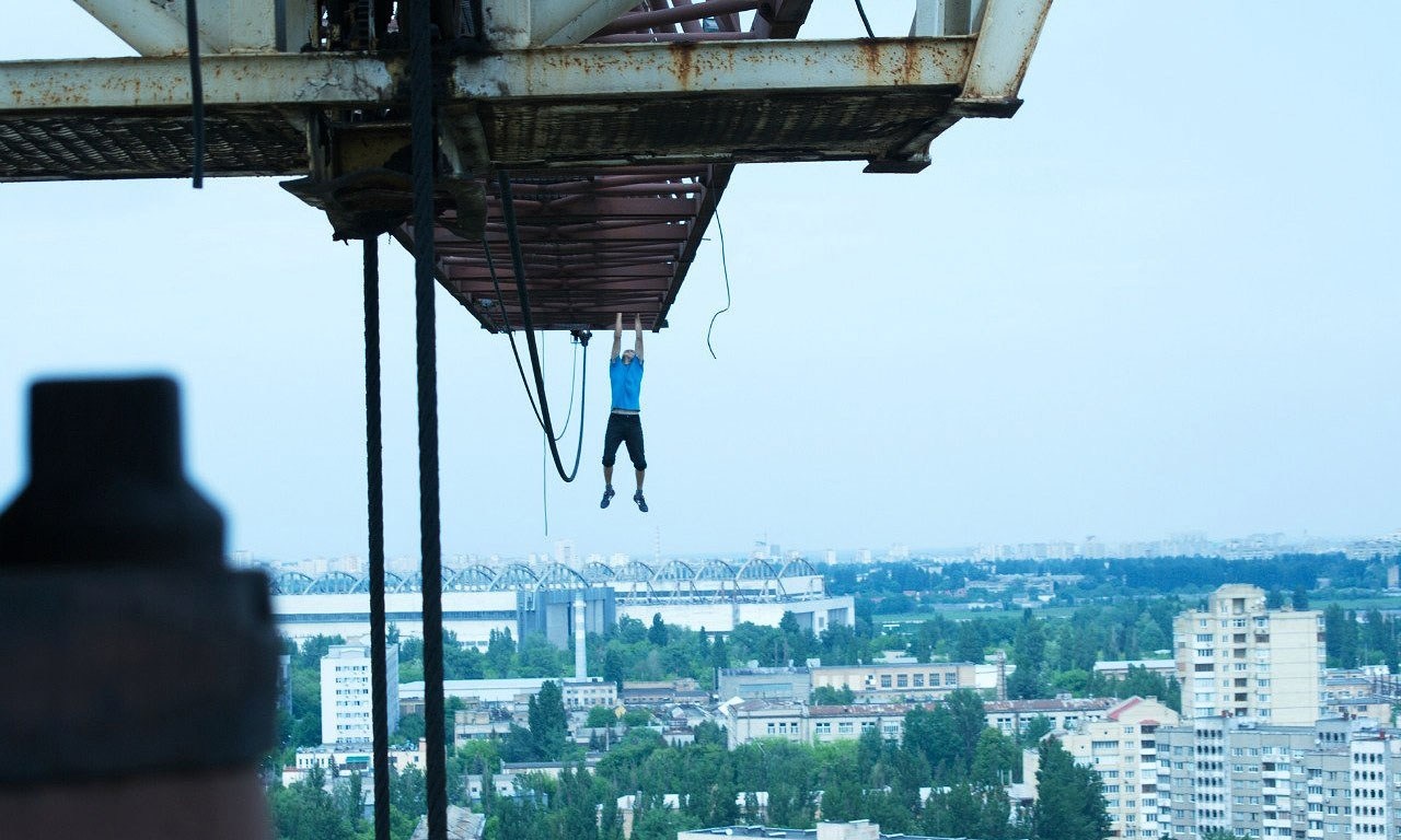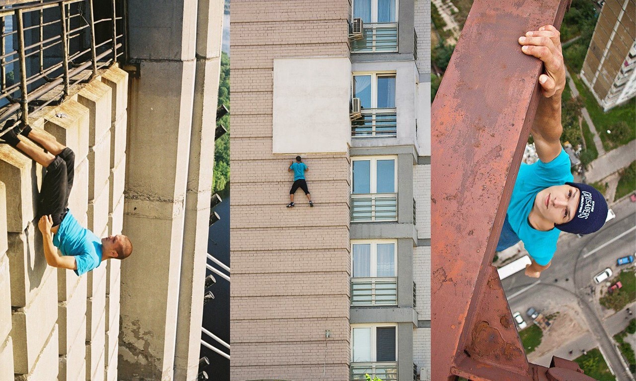 | Một nam thanh niên bất chấp nguy hiểm khi tập cơ bụng ở một tòa nhà cao tầng, leo tường không cần dây an toàn và đánh đu một tay trên thanh thép rất cao so với mặt đất. |