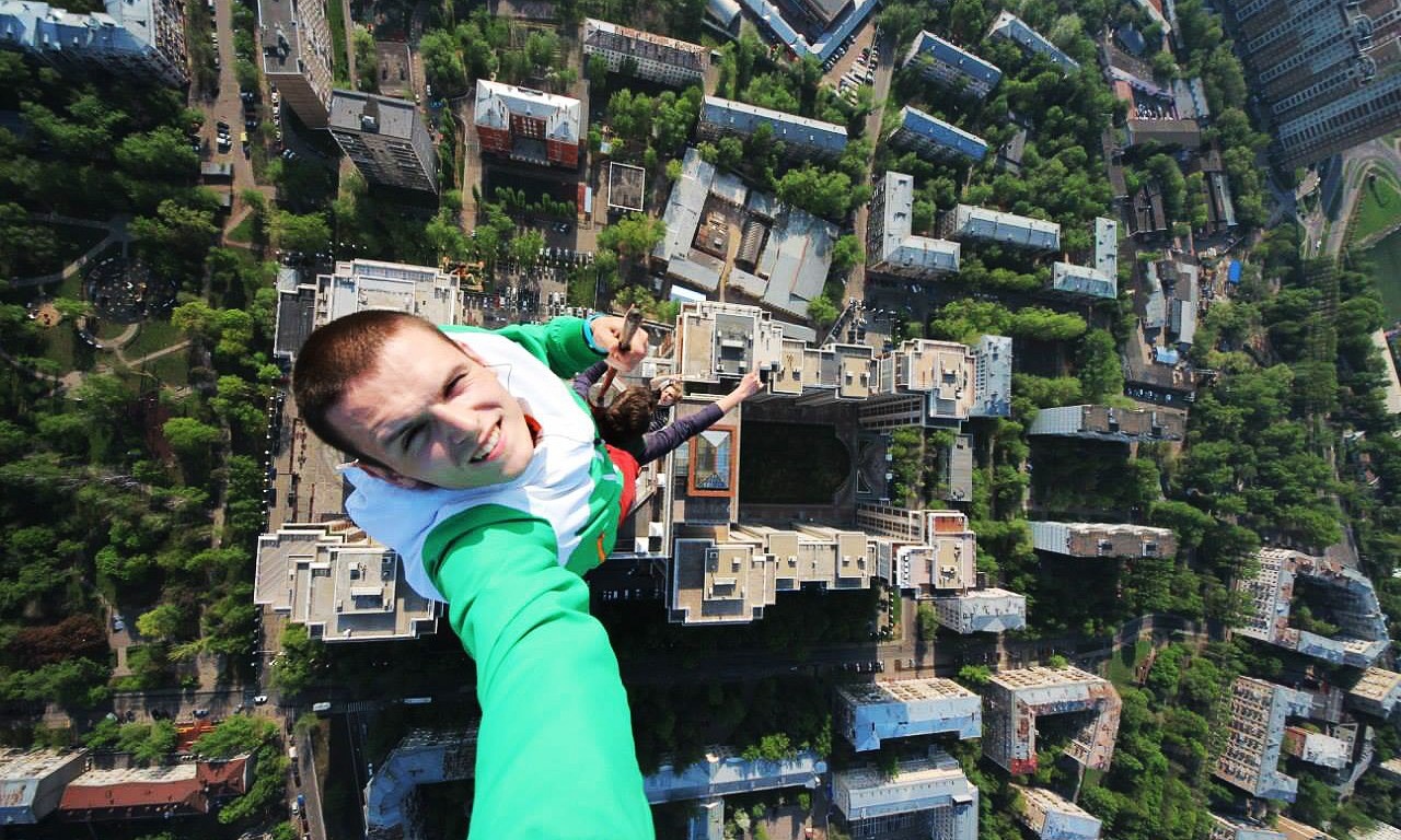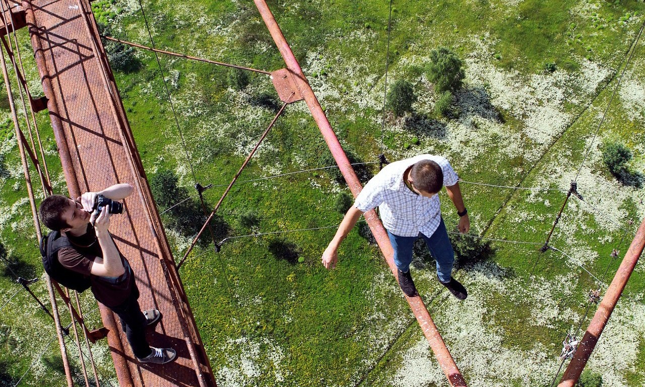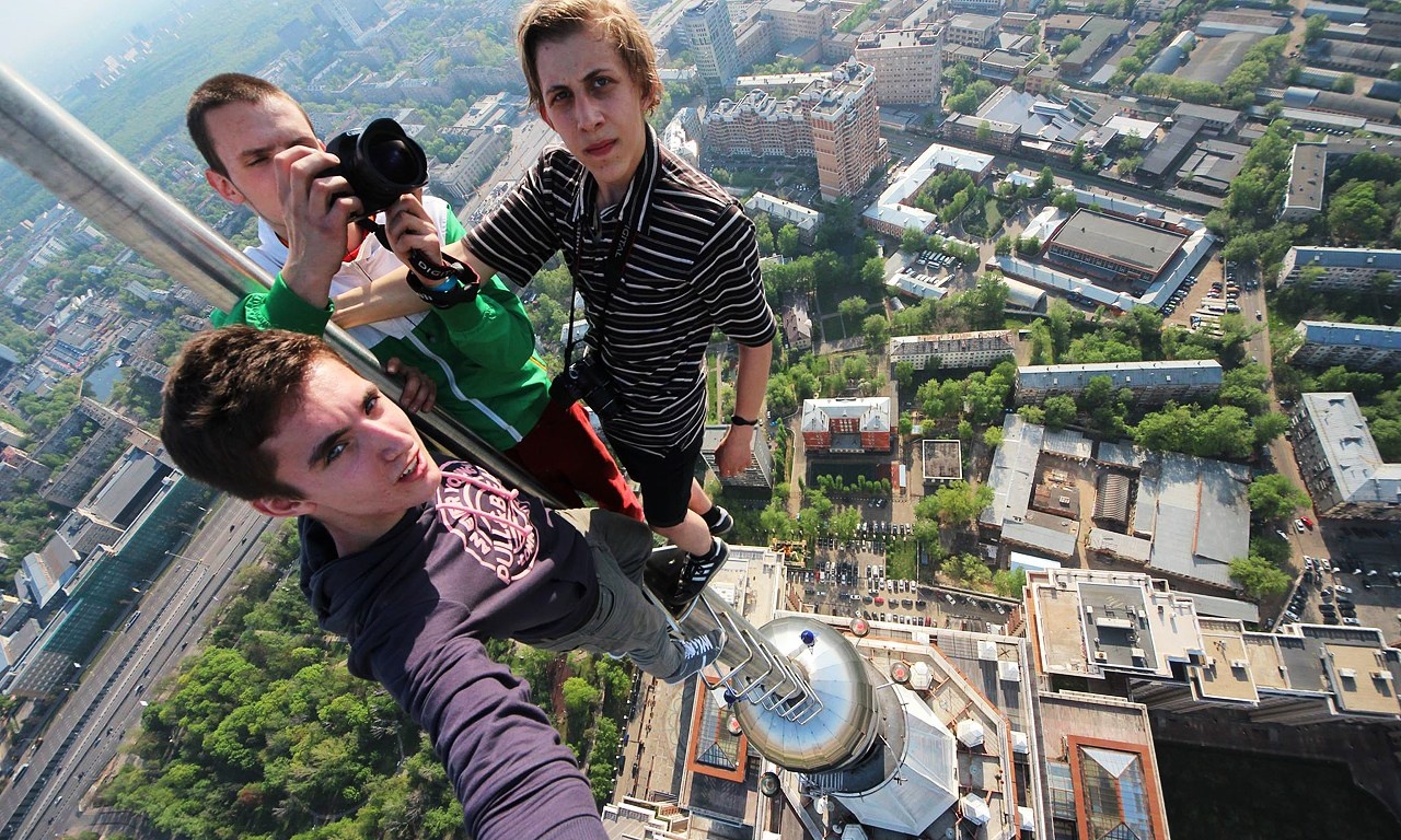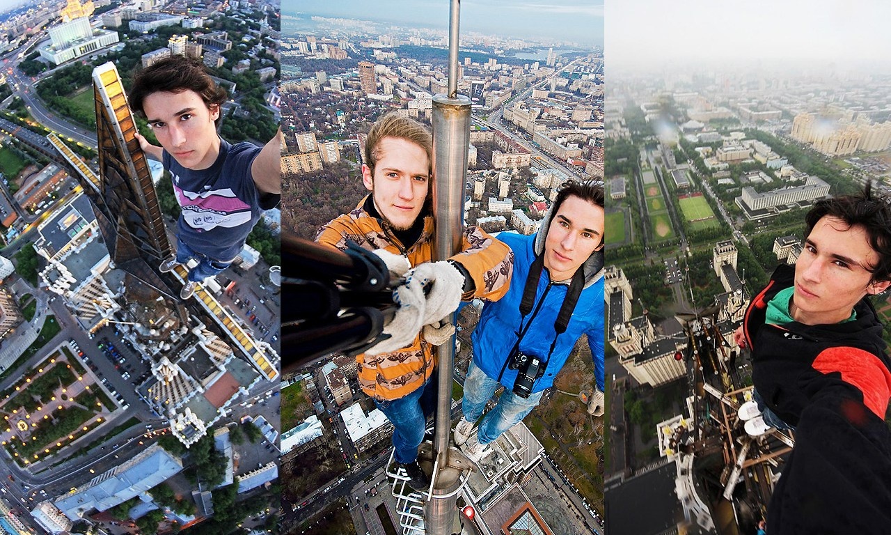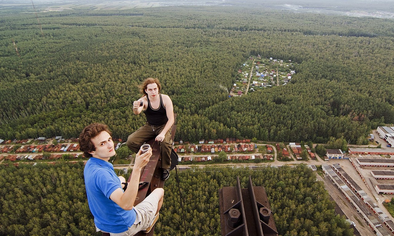 | Các thanh niên trèo lên một cột tháp rất cao và hào hứng chụp những tấm ảnh về thành phố phía dưới. |