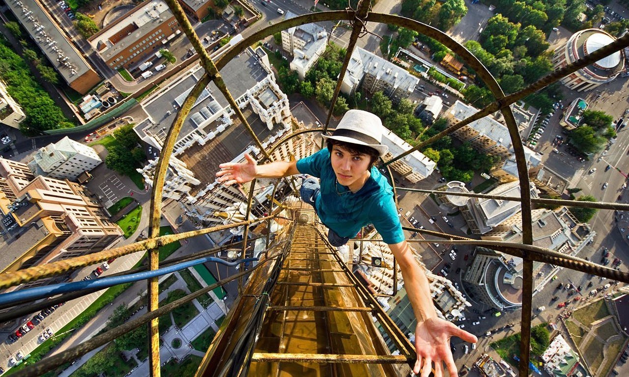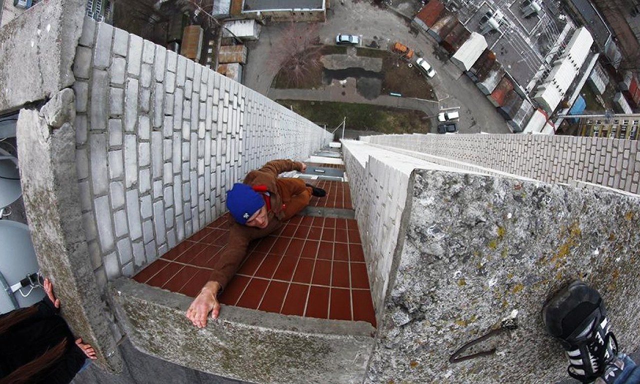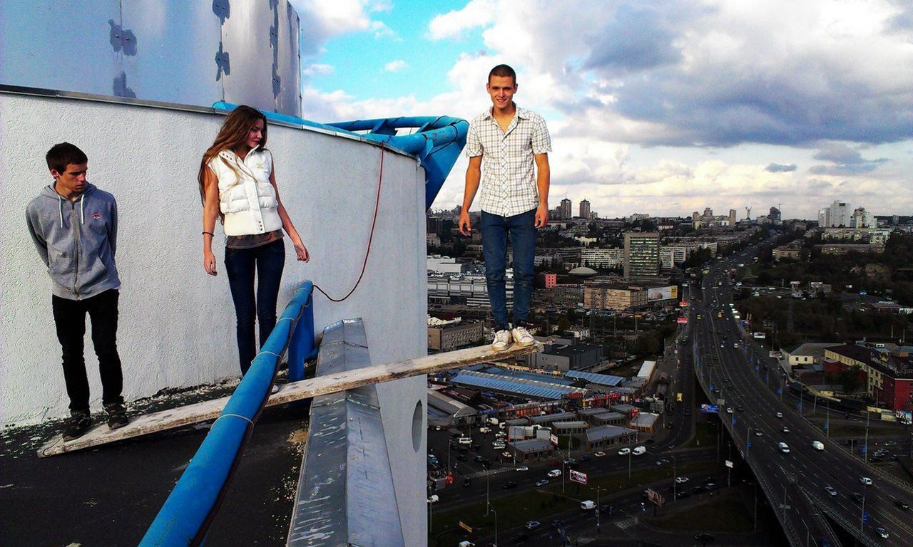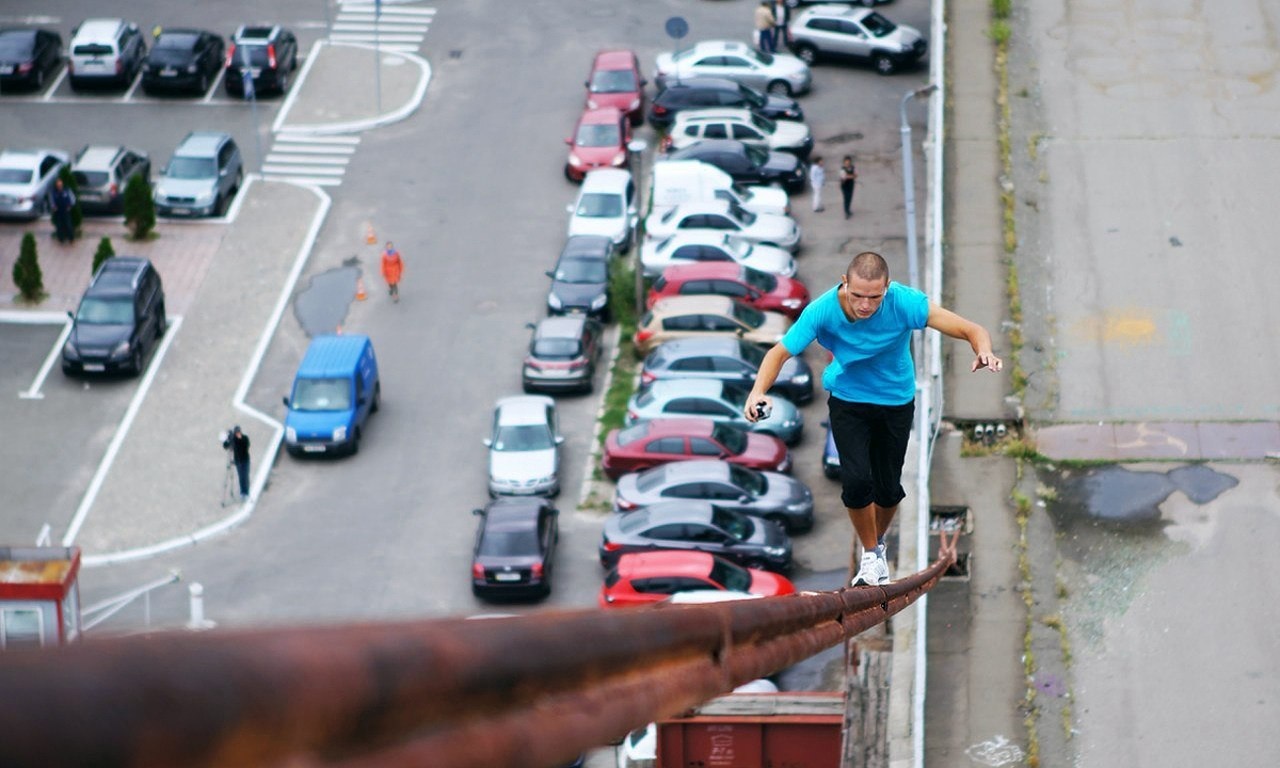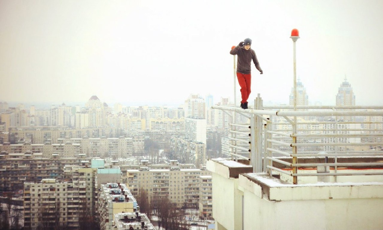 | Thử cảm giác mạnh bằng việc đi trên lan can của một nóc của tòa cao ốc. |