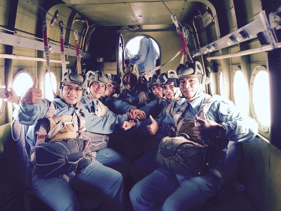 Cũng biết cái cảm giác lao vào không trung nó vừa thích vừa sợ nhưng nếu mình chùn bước, mình sẽ mất nhịp và mất tự tin, đồng đội phía sau cũng sẽ chùn bước theo. Vậy nên phải lao ra thôi! Lao ra và rơi tự do - không định hình - không phương hướng. 3 giây là quá dài, nó dài hơn cả 2 giây. Lúc đó chỉ chờ dù nó giật ngược mình lại! Xong! It's show time. Đến giờ thưởng thức ngắm cảnh, ngắm đồng đội phía trên, ngắm mặt đất".