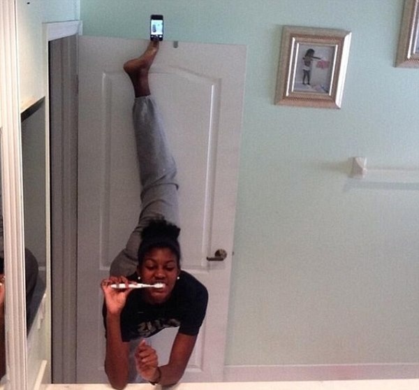 | Vừa đánh răng vừa kẹp điện thoại trên ngón chân cái. |