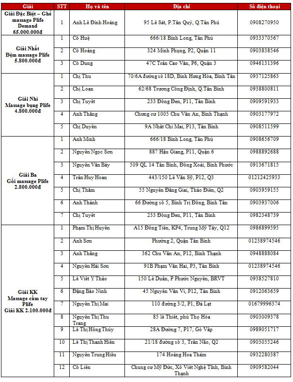 Danh sách khách hàng may mắn trúng thưởng gồm có: