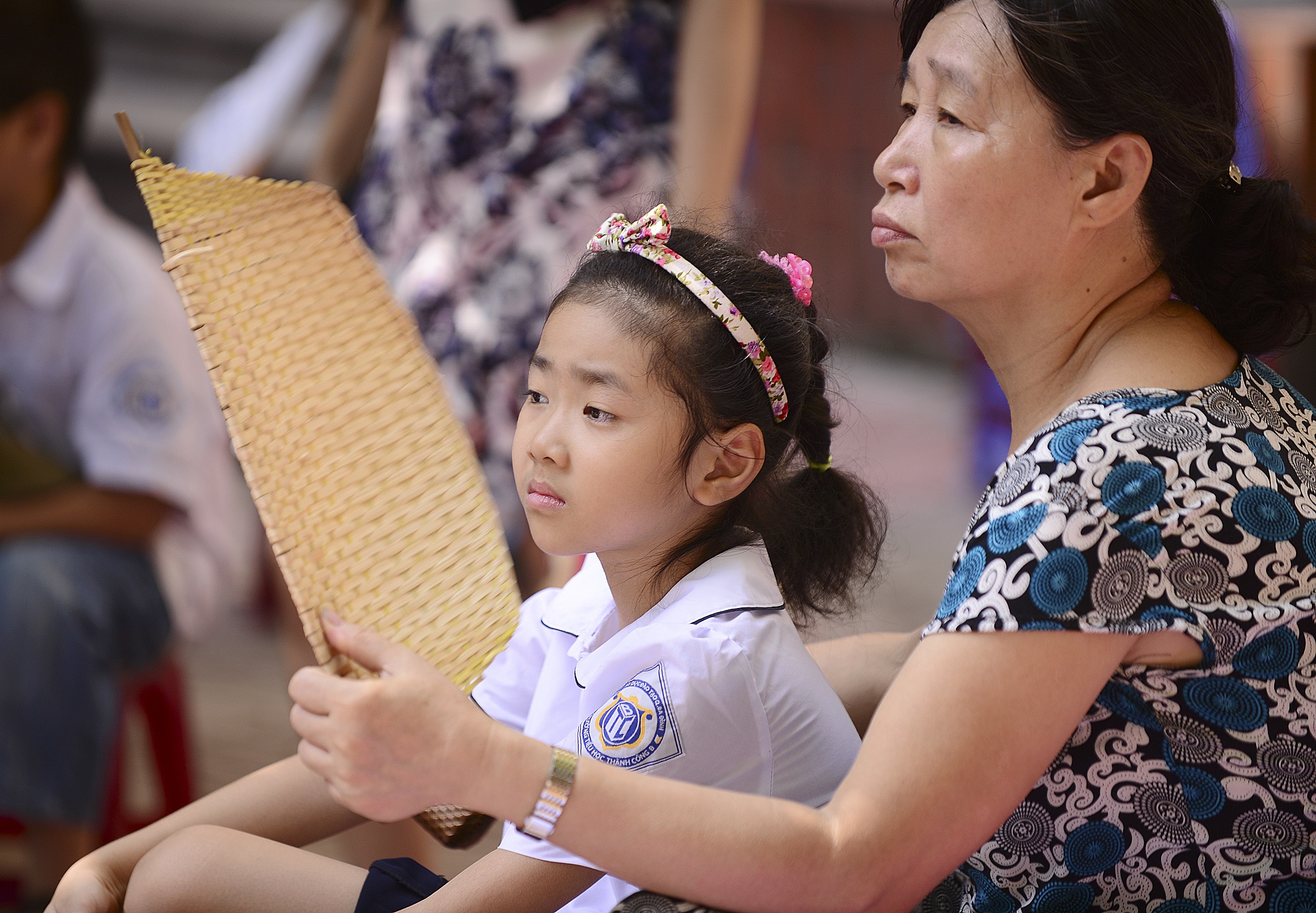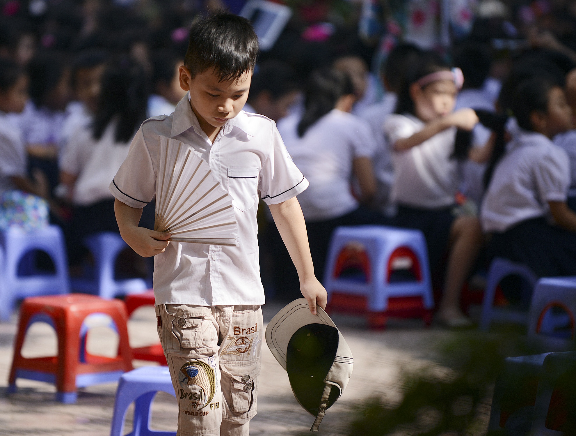| Một bé lớp trưởng đứng lên quạt cho các bạn khỏi nóng. |