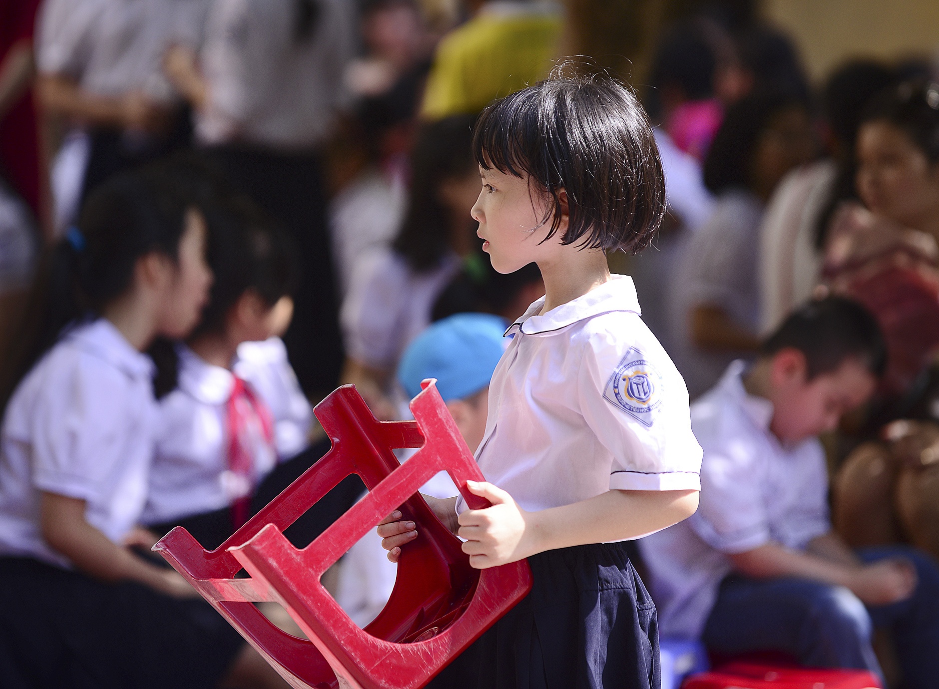 | Các bé cầm ghế chạy đi chạy lại liên tục vì bóng cây nhanh chóng bị thay đổi. |