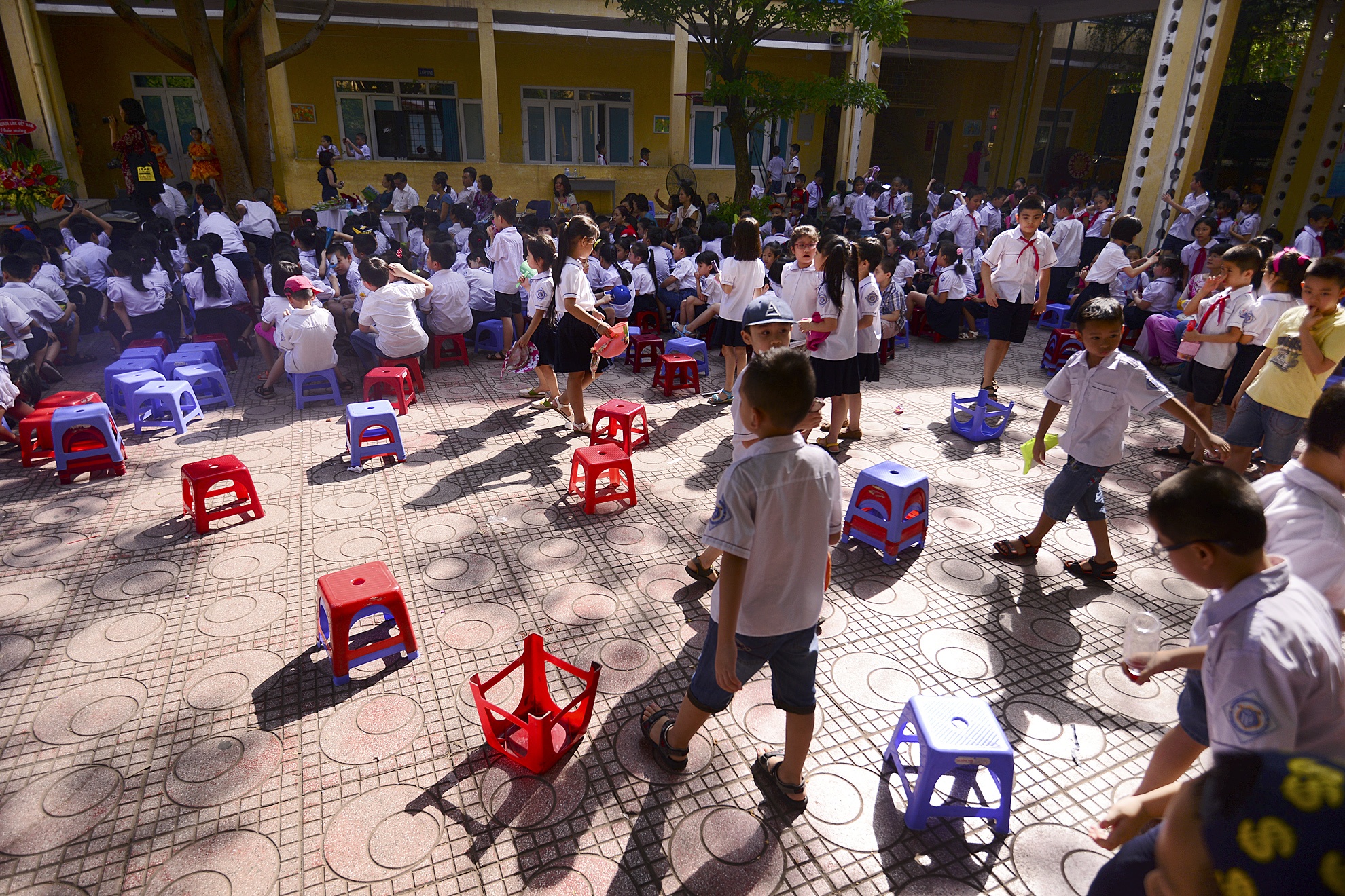 | Sáng 27/5, nhiều trường tiểu học ở Hà Nội đồng loạt làm lễ bế giảng. Hình ảnh tại trường Thành Công B (quận Đống Đa). Các em phải tìm chỗ có bóng cây ngồi, tránh nắng nóng nên không còn hàng lối một cách ngay ngắn, trật tự. |