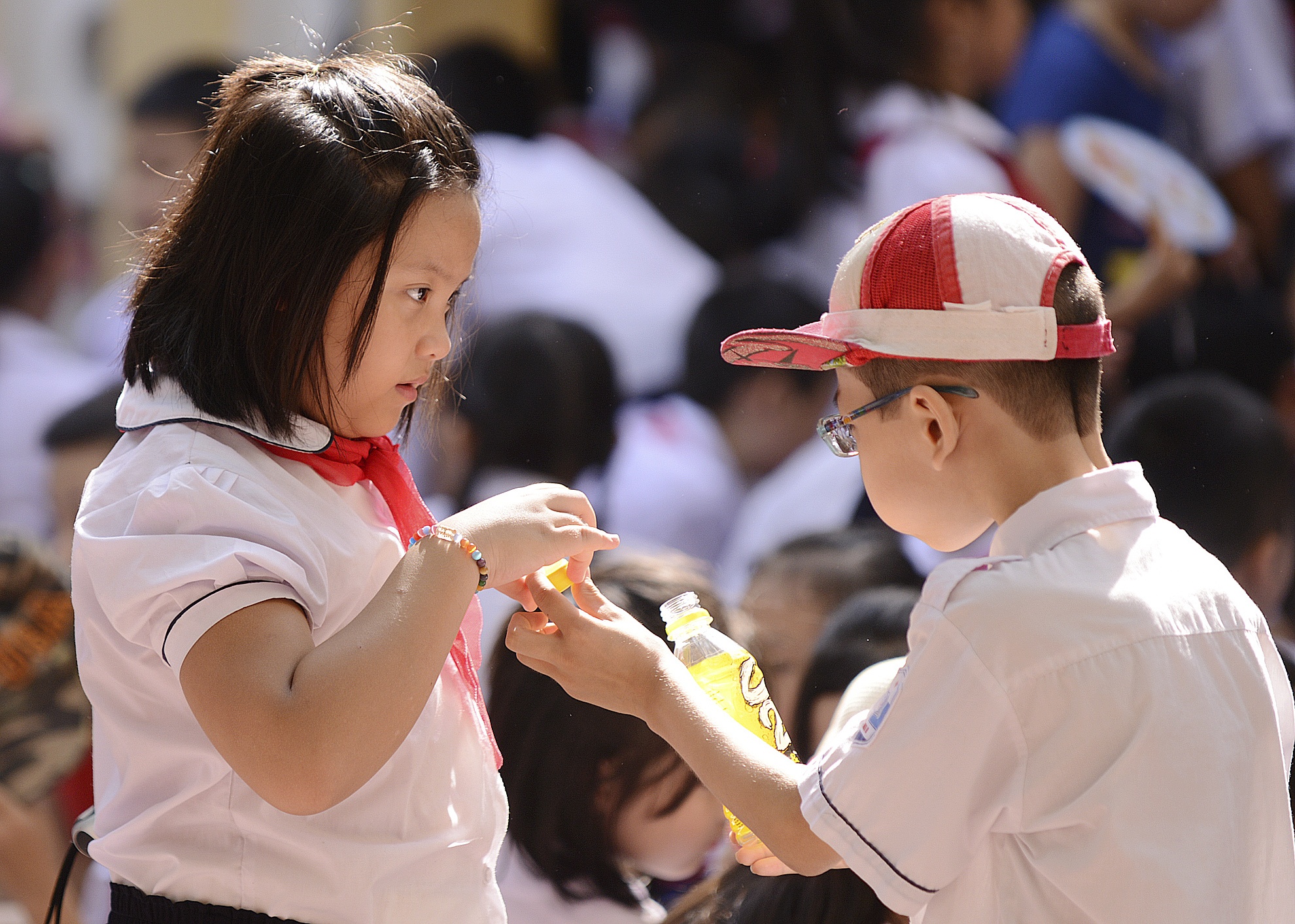 | Tập trung từ 7h sáng, sau 3 giờ đồng hồ các em mới được về. Lúc này nhiệt độ đã lên tới 39 độ C. |