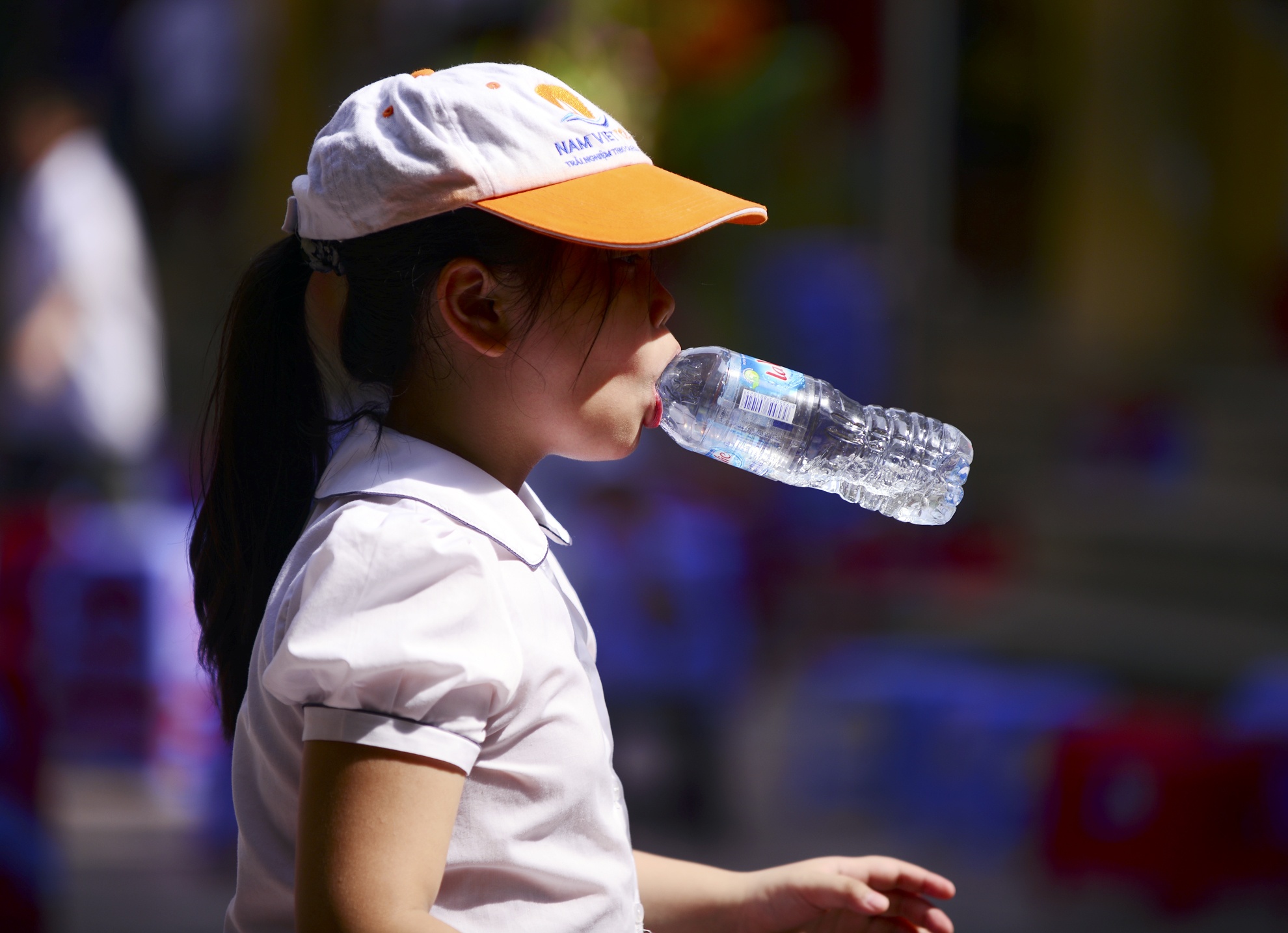 | Nhiều học sinh được phụ huynh cẩn thận cho mang theo nước uống nhưng khi chưa đến giờ làm lễ chính thức có em đã tu hết sạch. |
