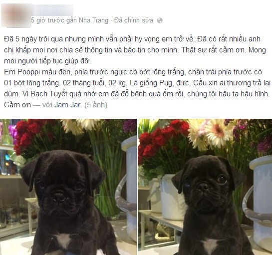 Ngày 25/8, trên mạng xã hội xuất hiện đoạn chia sẻ cùng nhiều hình ảnh với nội dung tha thiết xin chuộc lại chú chó Pug, giống đực, lông đen, gần 2 tháng tuổi của anh Nguyễn Hoàng, sống tại Nha Trang, khiến cộng đồng mạng chú ý.