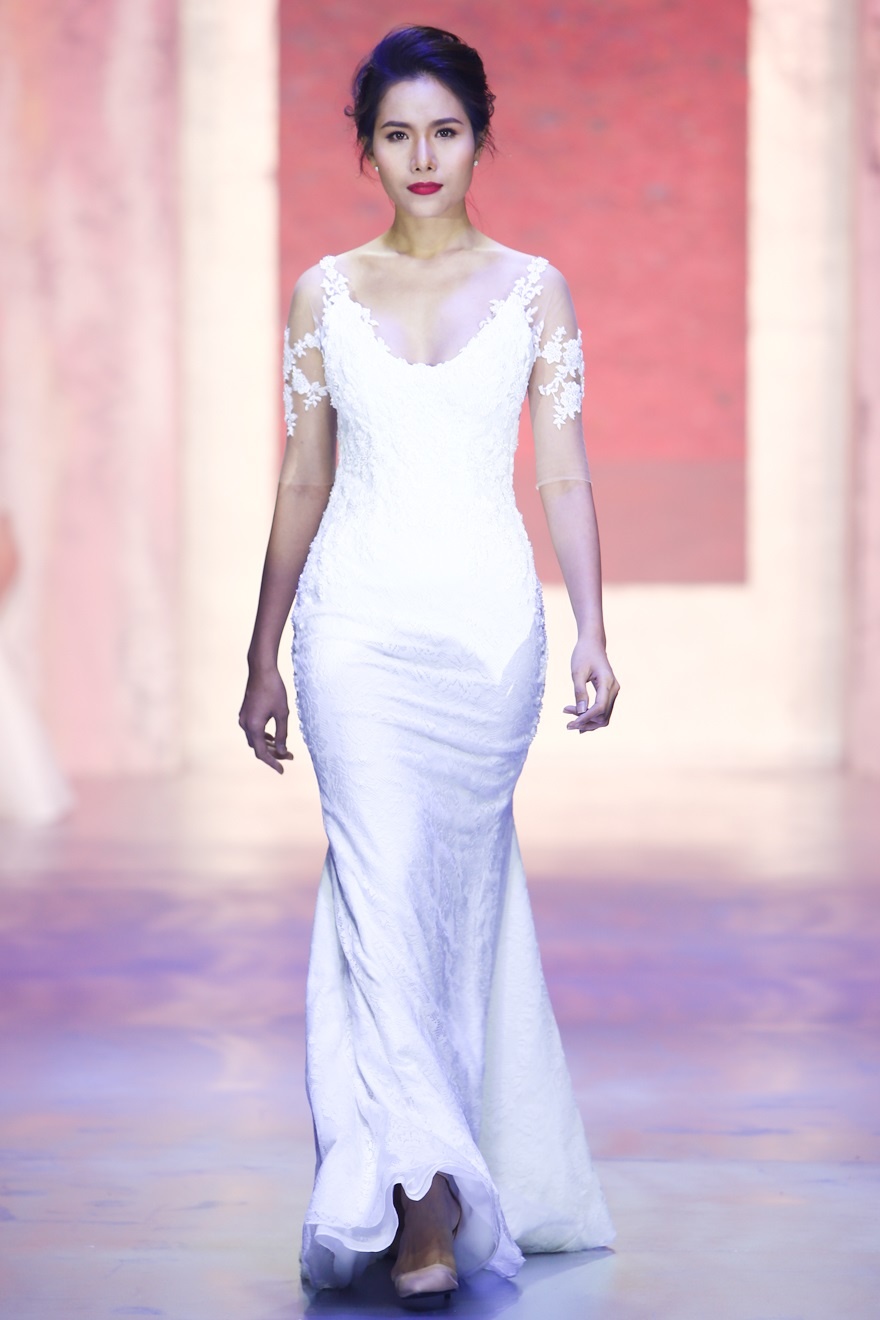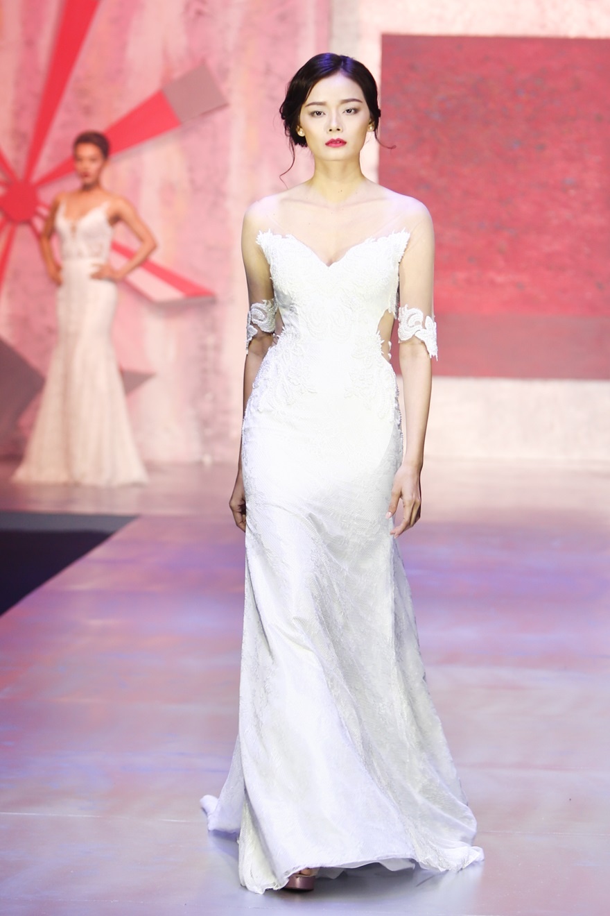 | Tối 26/11, Triệu Thị Hà tham gia trình diễn chương trình thời trang áo cưới tại TP HCM. Trên sàn diễn mùa cưới, Hoa hậu các dân tộc Việt Nam 2011 khoe dáng trong thiết kế đầm ôm, ren voan mỏng tinh tế và gợi cảm. |