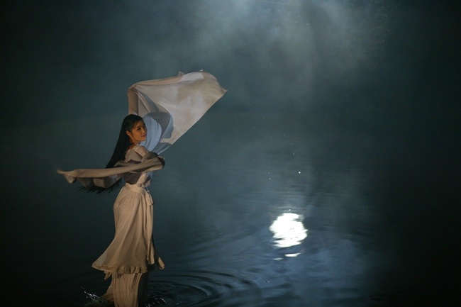 | Triệu Thị Hà trầm mình xuống nước trong một cảnh quay. |