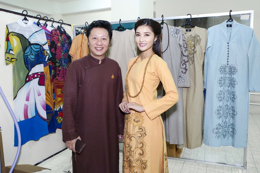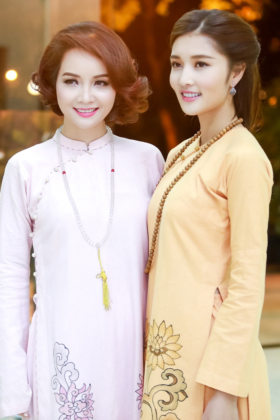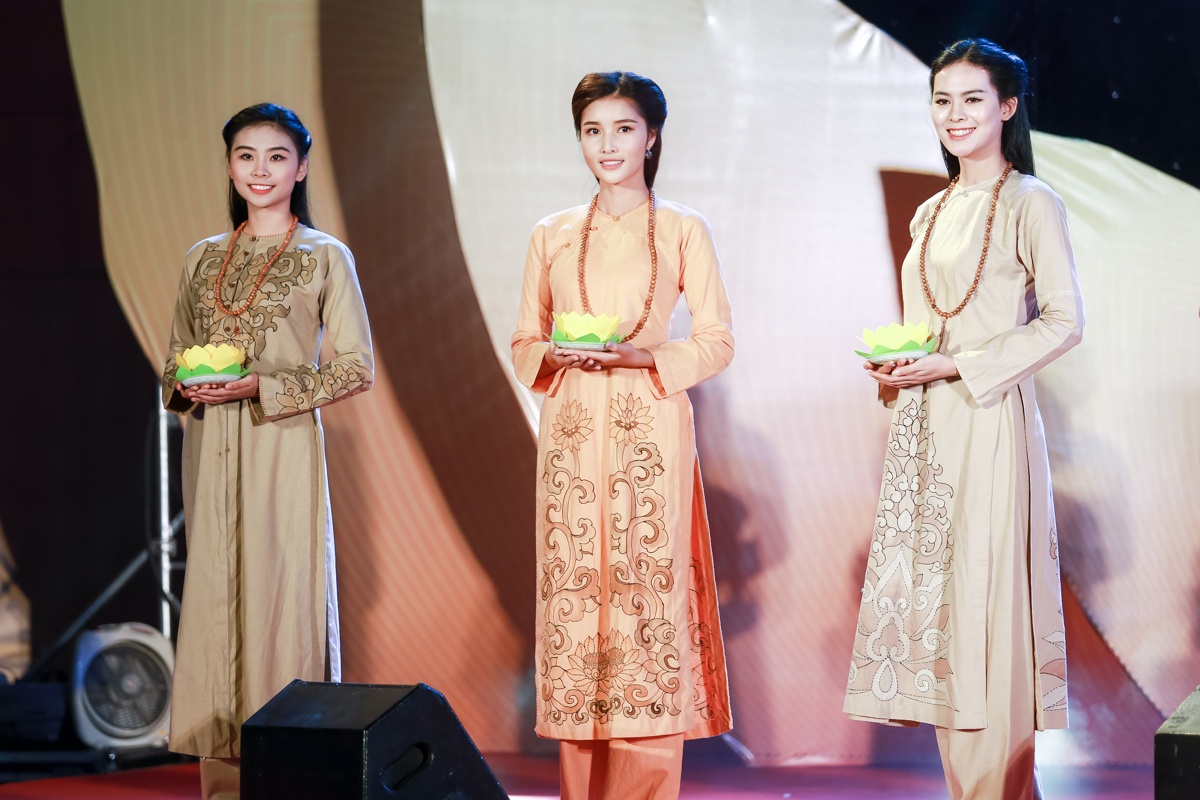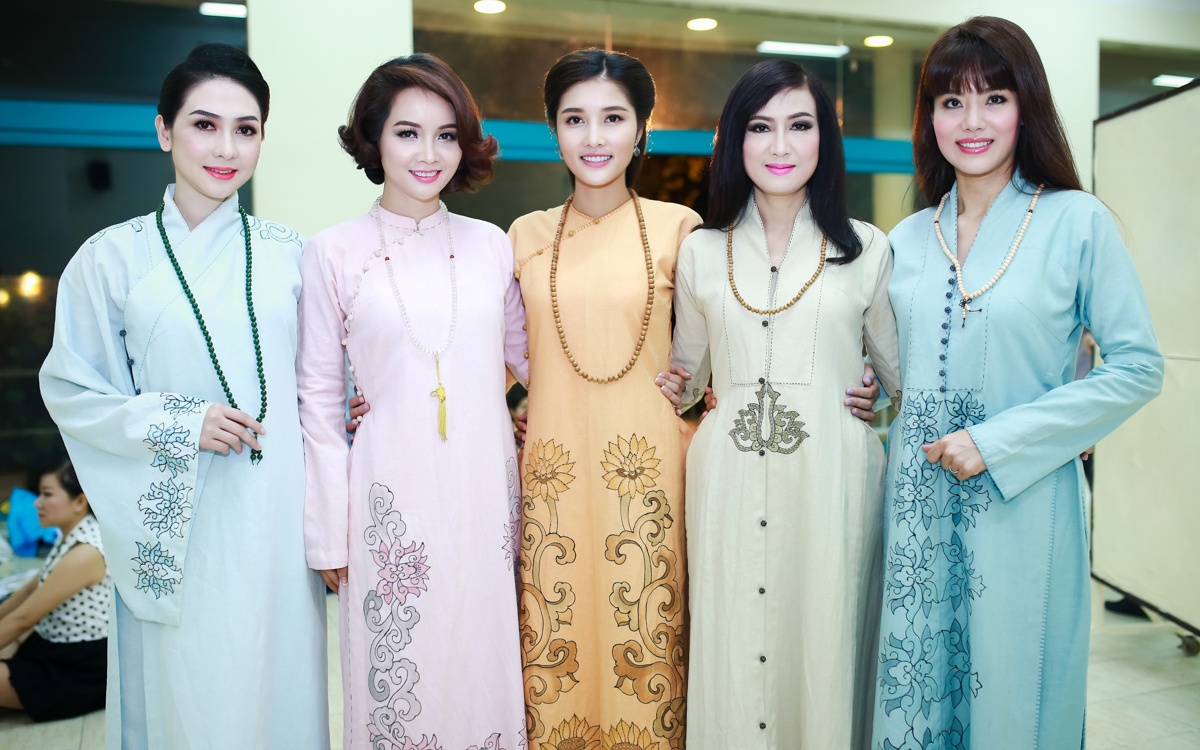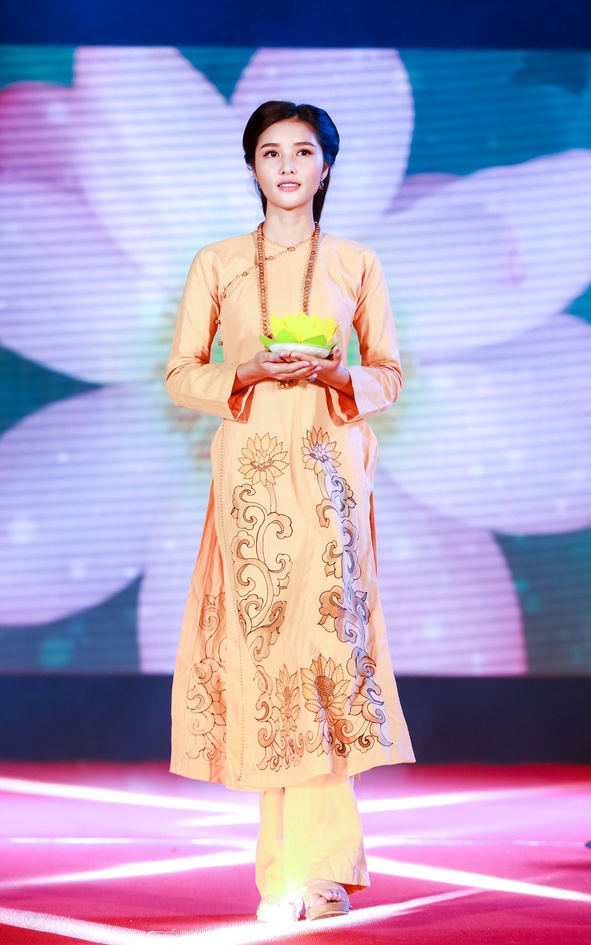 | Diễn viên Hiền Mai đằm thắm khi trình diễn mẫu áo dài cách tân dành cho các Phật tử. |