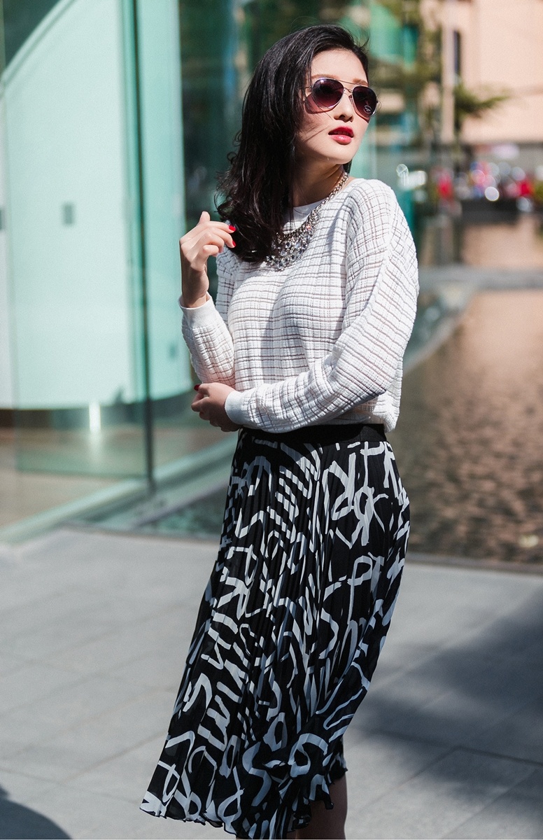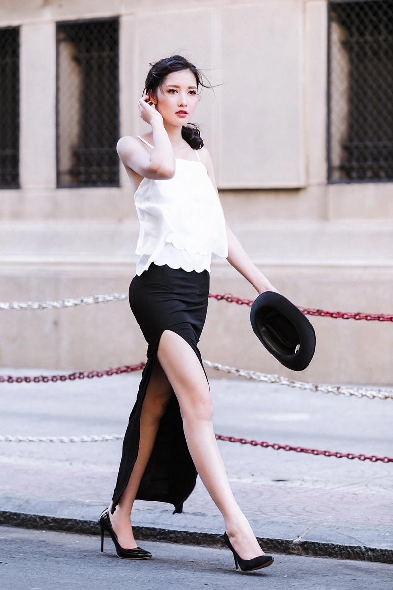 | Gu thẩm mỹ của người đẹp được thể hiện thông qua cách chọn gam màu và phối các items ăn ý. Chân váy xẻ cao giúp người mặc thoải mái tản bộ trên phố. |