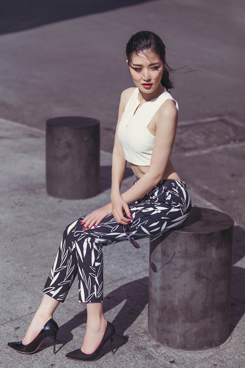 | Với ngoại hình cao ráo, số đo ba vòng chuẩn người mẫu, Triệu Thị Hà tự tin khi ứng dụng xu hướng thời trang xuân hè 2015. Trong ảnh, người đẹp mạnh dạn diện mốt áo crop-top ngắn cũn, để lộ vòng eo thon gọn. Cô là một trong những chân dài Việt may mắn sở hữu nước da trắng hồng và số đo vòng eo đáng mơ ước. |