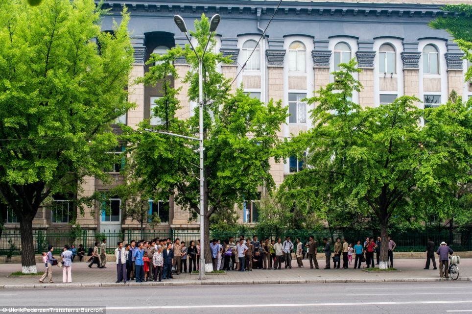 | Những người lao động đang chờ xe buýt tại trung tâm thành phố Bình Nhưỡng với hệ thống giao thông công cộng khá đơn sơ. |
