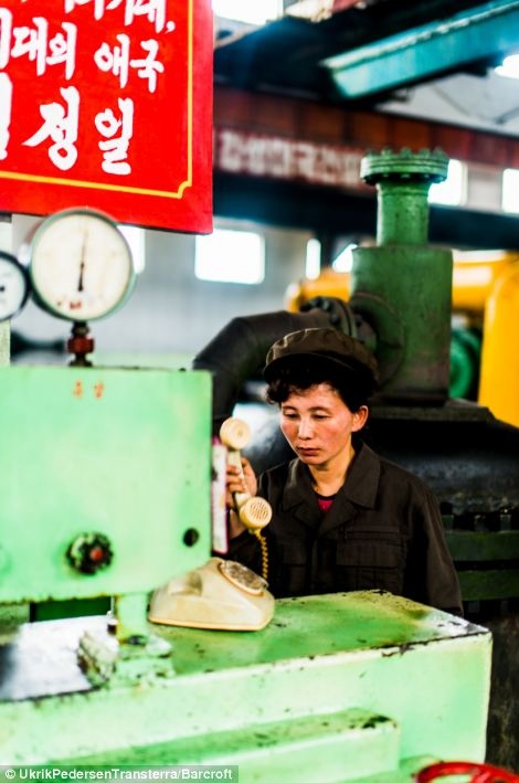 | Một công nhân nữ trong nhà máy sản xuất phân bón ở Hamhung sử dụng điện thoại rất cũ. |