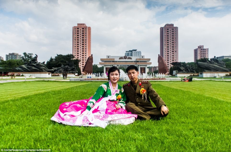| Cặp vợ chồng mới cưới chụp ảnh trên bãi cỏ gần đài phun nước ở thành phố Bình Nhưỡng sau đám cưới. |