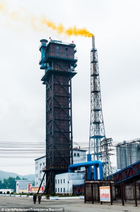 | Những cột khói thải màu vàng bay ra từ hệ thống ống khói của nhà máy ở Hamhung. |