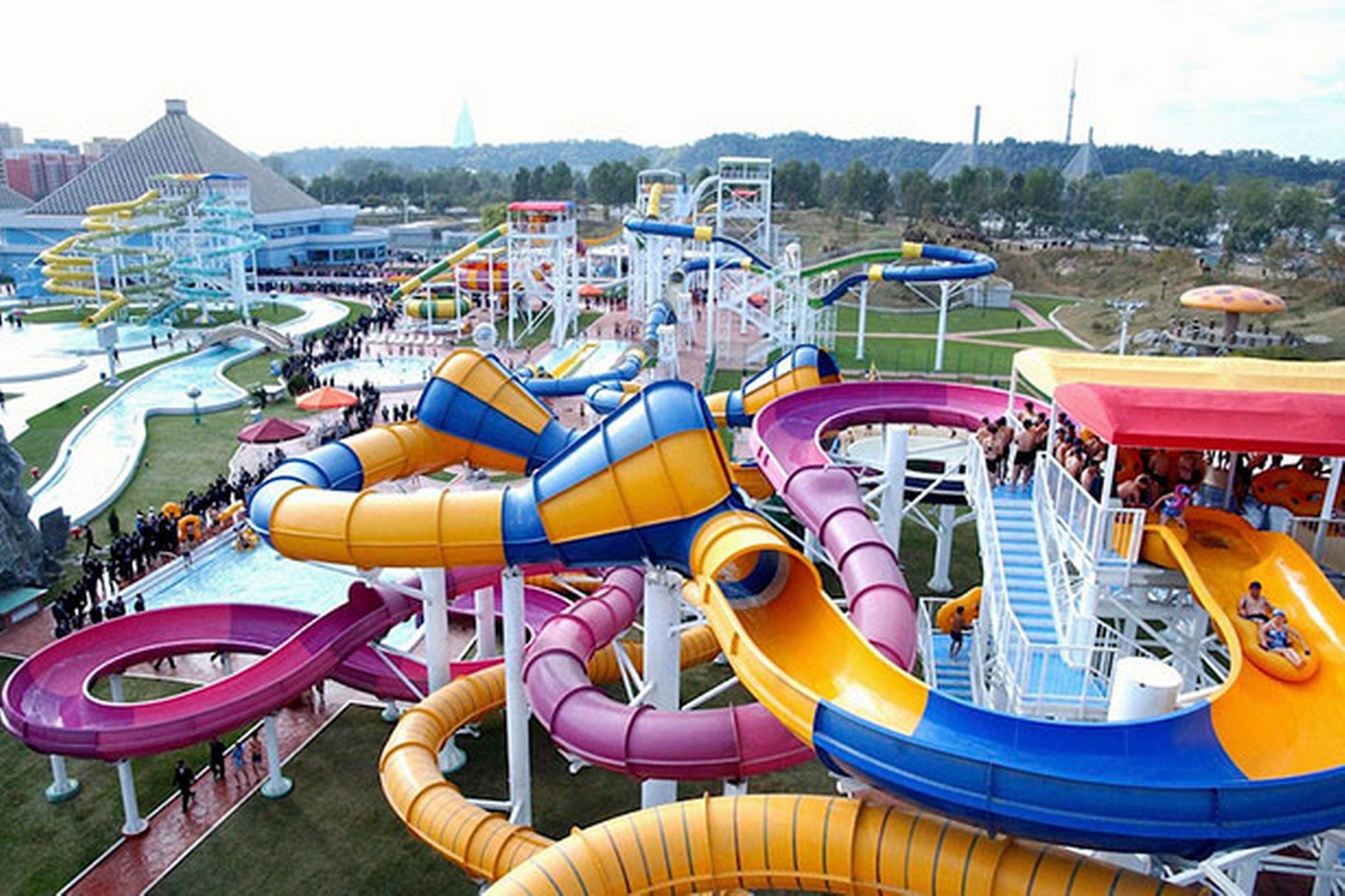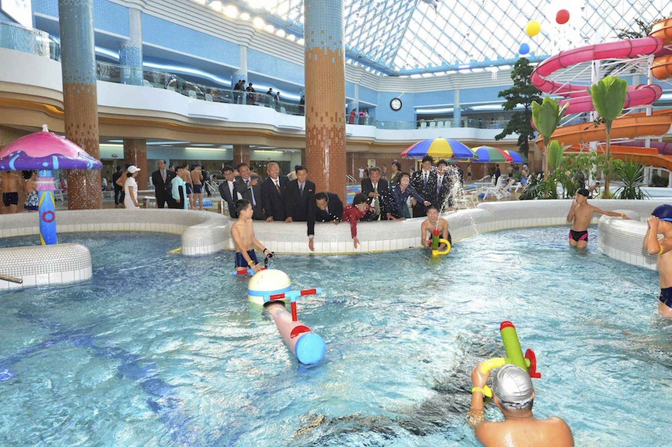 Theo hãng thông tấn Trung ương Triều Tiên (KCNA), công viên nước mới khai trương này “rộng hàng chục nghìn m2 trên bờ sông Songchon. Nó được trang bị một tháp trượt, vài đường trượt, bể bơi trong nhà, hồ cạn trong nhà và các cơ sở dịch vụ, giải trí, thể thao”. KCNA khẳng định việc xây dựng công viên nước sẽ góp phần nâng cao đời sống văn hóa, xã hội của công nhân và các cá nhân khác, bao gồm các học sinh trong thành phố. Ảnh: KCNA.