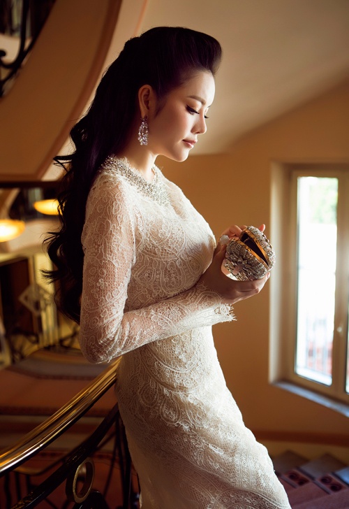 Hoa hậu Kỳ Duyên với son môi hồng nude tinh tế, phù hợp với bộ đầm hàng hiệu.