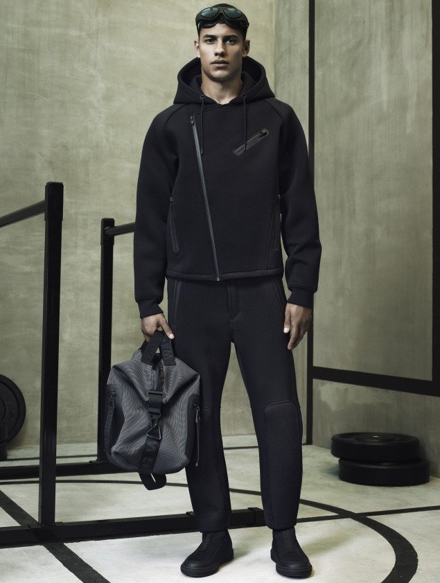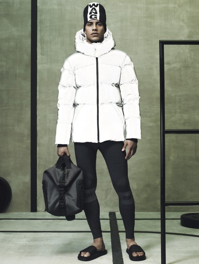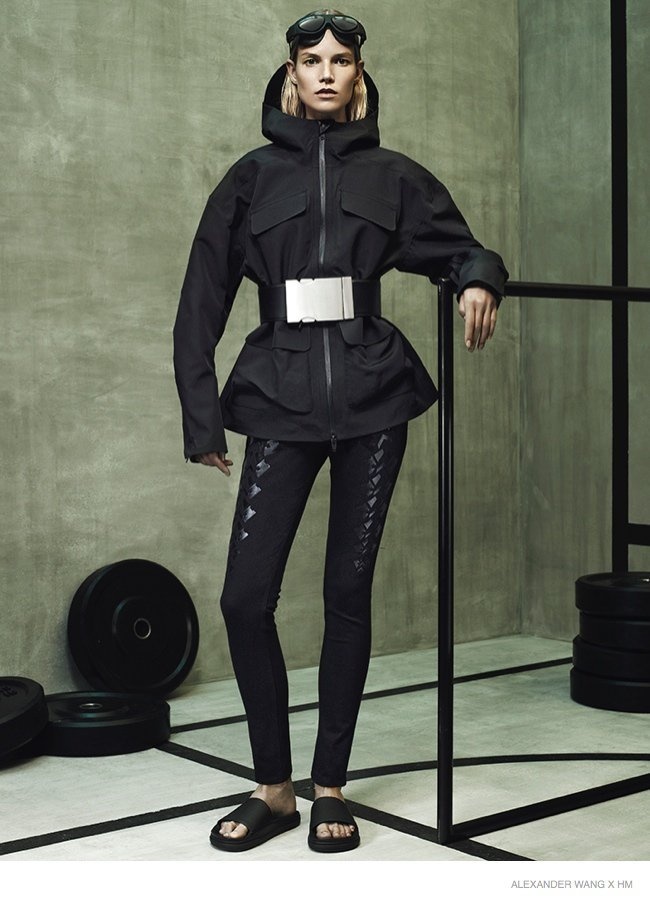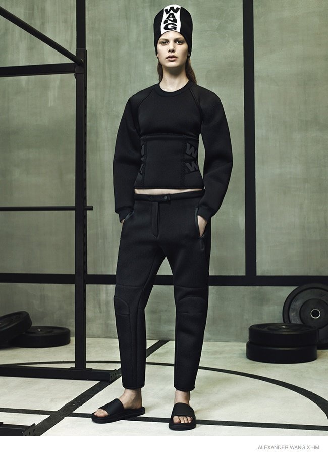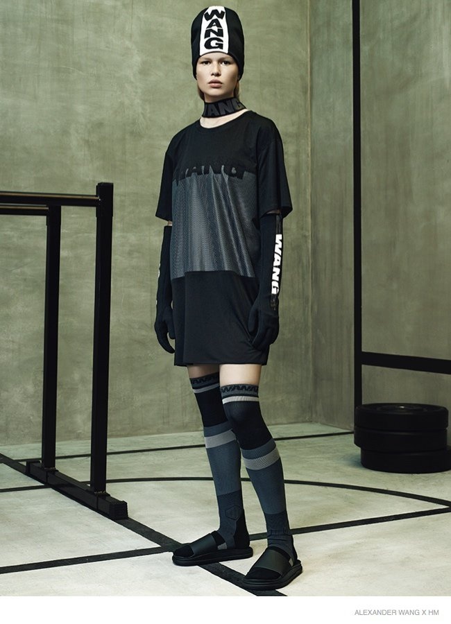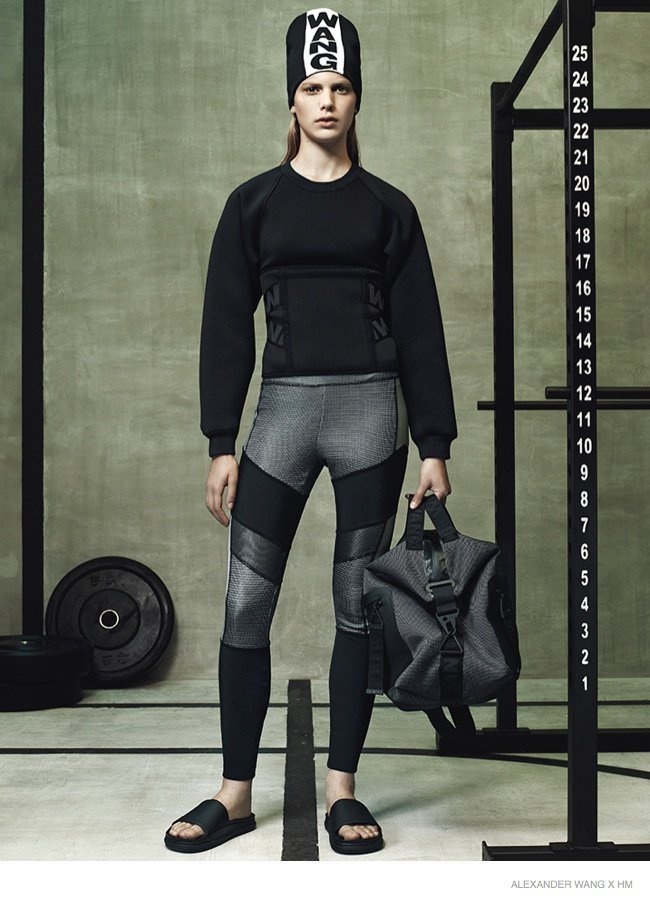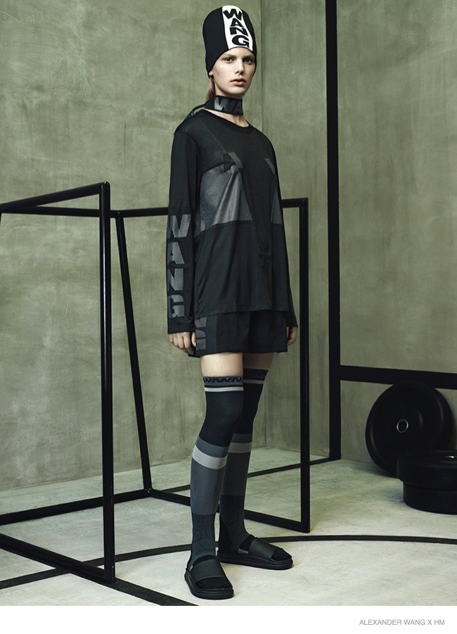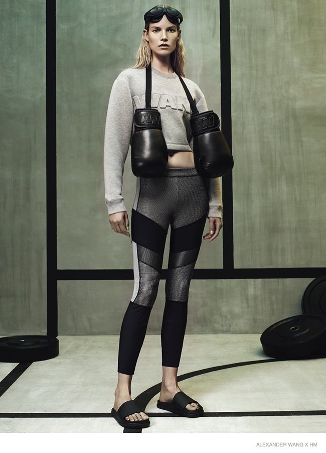 Ngoài việc gói gọn trong 2 sắc đen-trắng đơn giản, hai cô mẫu trẻ Anna Ewers và Suvi Koponen như vừa bước ra từ phòng tập gym với các thiết kế mới nhất Alexander Wang x H&M bao gồm áo bra thể thao, áo nỉ, legging và găng tay boxing. Wang khẳng định rõ dấu ấn trên cái thiết kế khi sử dụng chính tên anh để làm điểm nhấn trên từng món áo quần hay phụ kiện. Về phía phái mạnh, Alexander Wang hướng đến những kiểu dáng áo khoác hay áo baggy to sụ, khỏe khoắn và nam tính, được kết hợp cùng quần shorts hoặc legging ôm sát. Trào lưu normcore cũng được nhiệt tình lăng xê với sự hiện diện của những chiếc sandal bệt tối giản về kiểu dáng, hay boots bệt cổ thấp cao vừa tầm bắp chân.